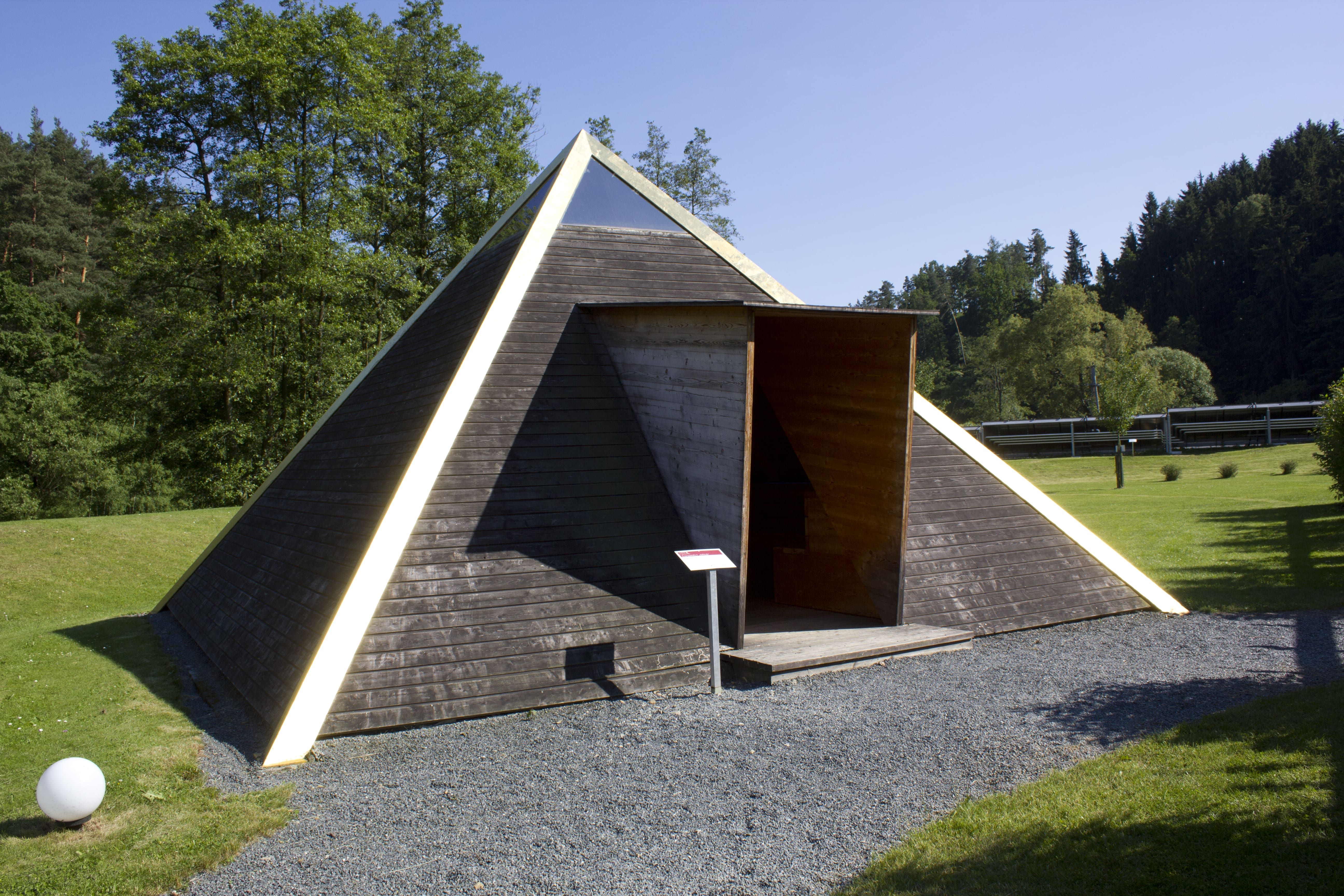 In die Pyramide kann man sich mit normaler Straßenbekleidung hineinsetzen – Decken liegen an der Rezeption auf.