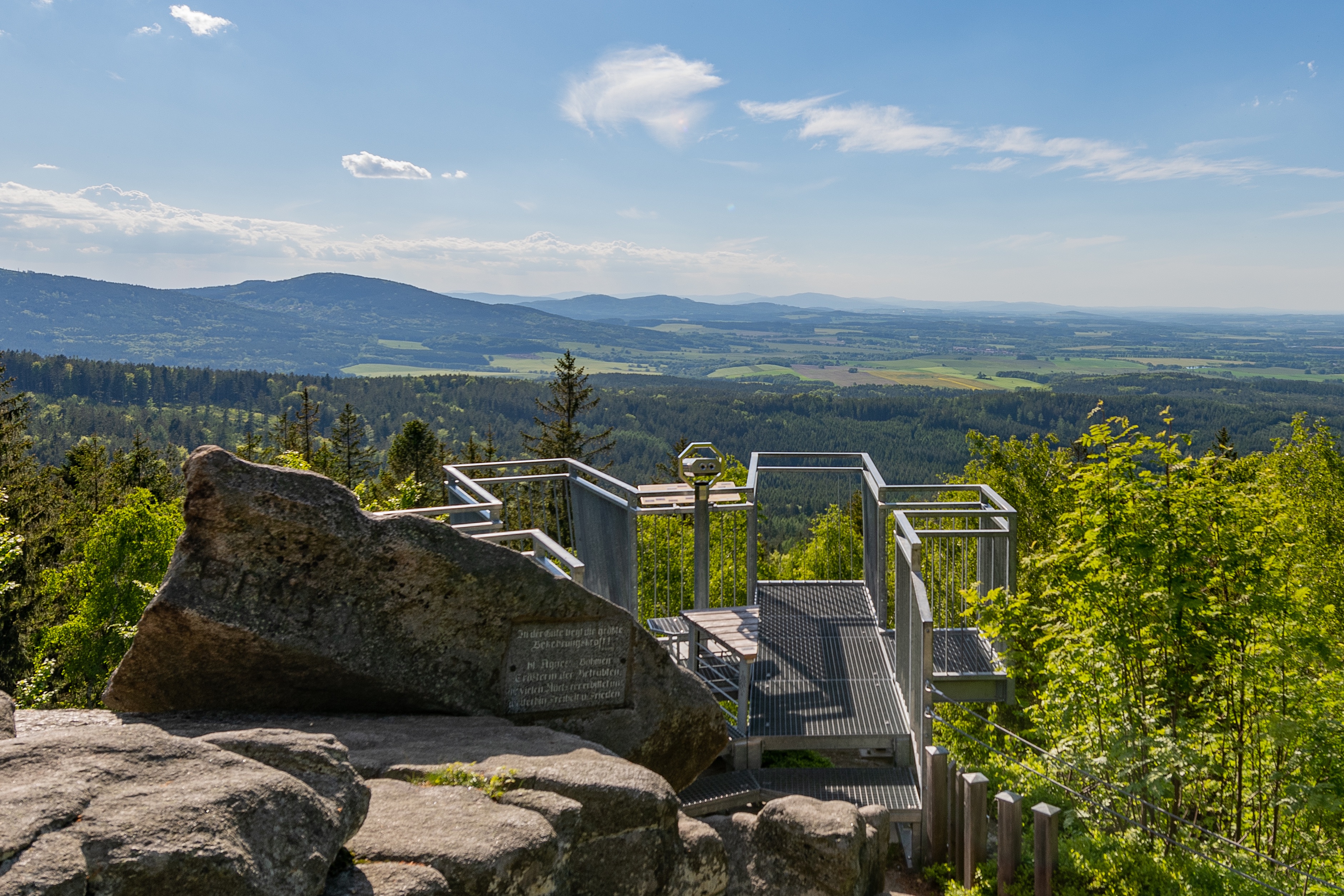 Der Mandelstein ist 874 m hoch und bietet einen weiten Ausblick nach Tschechien bzw. in das Gratzener Land. Den Gipfel erreichen Sie leicht nach einem Aufstieg von etwa 20 Minuten vom Parkplatz aus. Der Weg zum Gipfel, mit seinem Gipfelkreuz, führt vorbei an einem Klanghäuschen und an der Gedenkkapelle. Sie finden Stationen, die Sie mit den Besonderheiten des Kulturraumes Waldviertel/Südböhmen vertraut machen. Die Aussichtsplattform wurde 2013 errichtet.