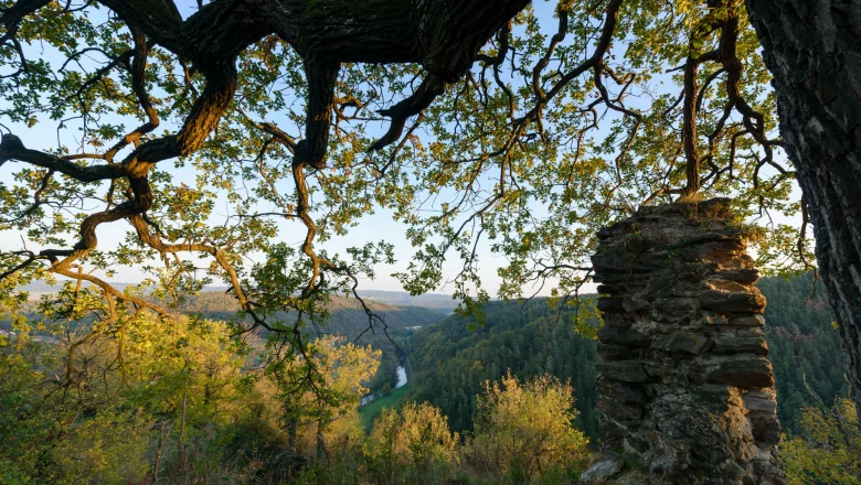 Heute ist das Felsennest nicht nur ein Ort der Geschichte, sondern auch ein lebendiges Naturparadies. Auf den Felsen und in den Trockenlebensräumen wachsen zahlreiche Blumen, und naturnahe Wälder mit knorrigen Eichen und mächtigen Buchen prägen das Landschaftsbild. Die Bäume scheinen wie stille Wächter über die Ruine und bewahren den Frieden, der nach den tragischen Ereignissen einkehrte.