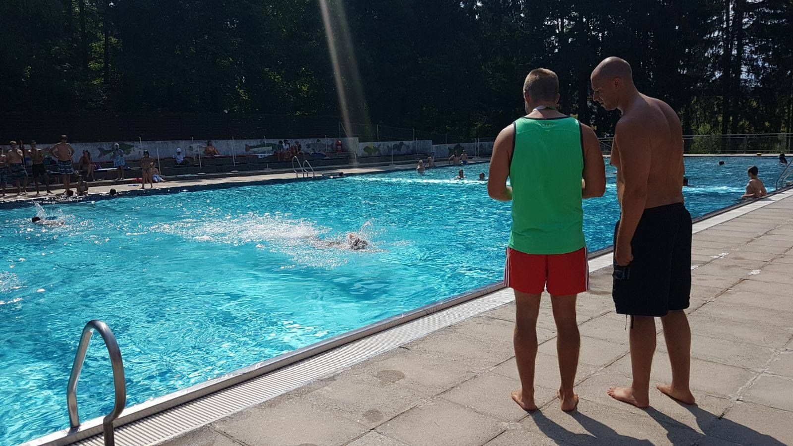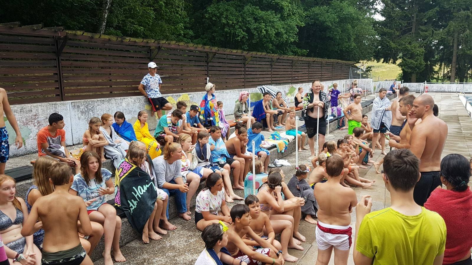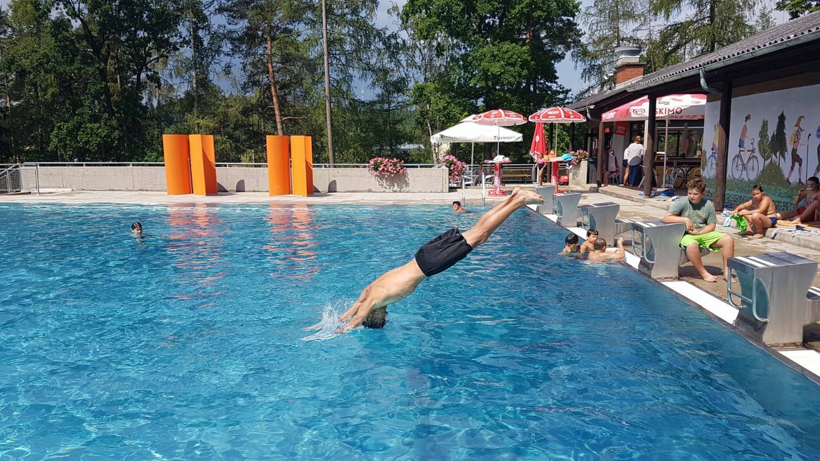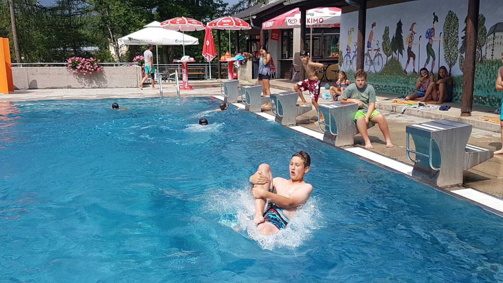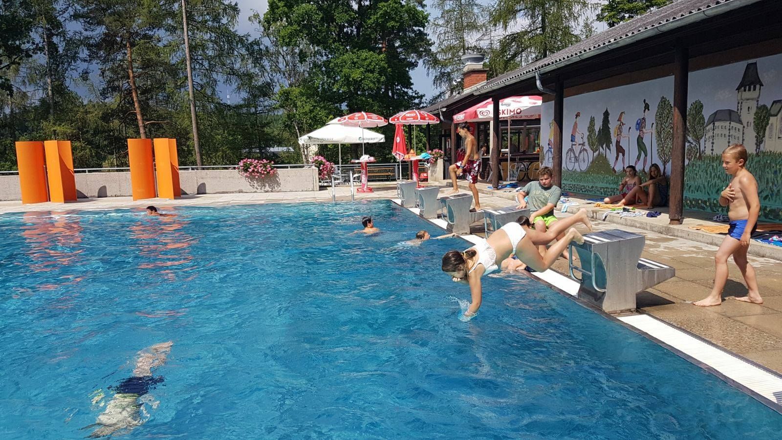 Beheiztes Sportbecken, Kinderbecken, große Liegewiese, Buffet, Spielanlagen, Umkleidekabinen, WC, Kinterrutsche, Wasserspielplatz