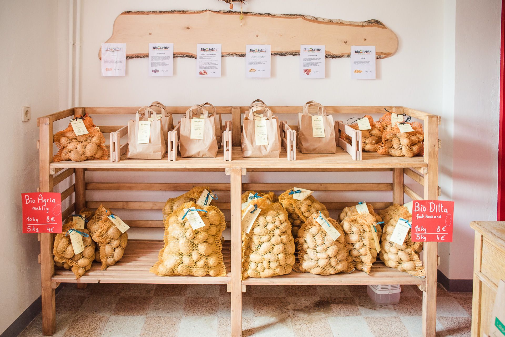 Dort bieten wir ausnahmslos Bioprodukte direkt vom Bauern an. Verschiedenste Erpfisorten, darunter auch bunte Raritäten, Eier, Honig, Nackthafer, Dinkelprodukte, Waldstaudenkorn, Hanfnüsse, Einkorn, Linsen, Apfelsaft, Nudeln,  als auch Kümmel oder Leinsamen finden sich dort. Dabei liegt uns neben der Qualität auch die biologische Zertifizierung am Herzen.