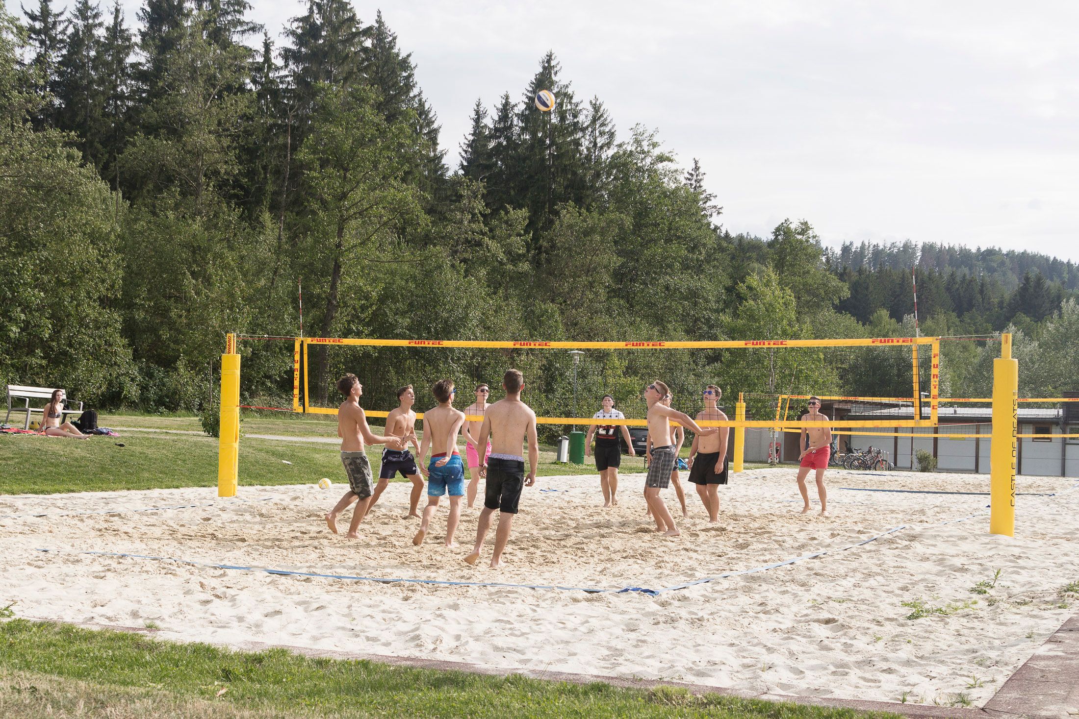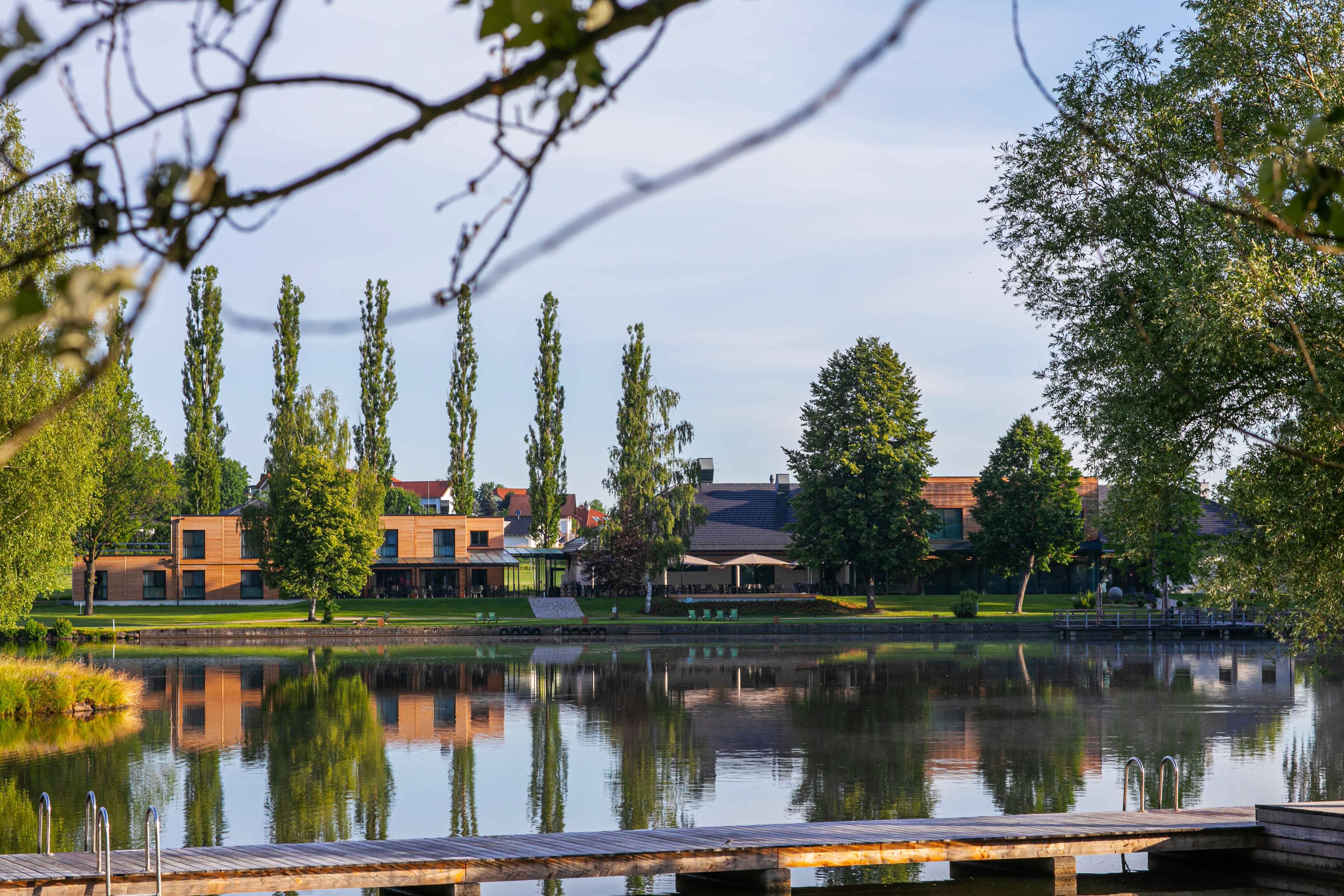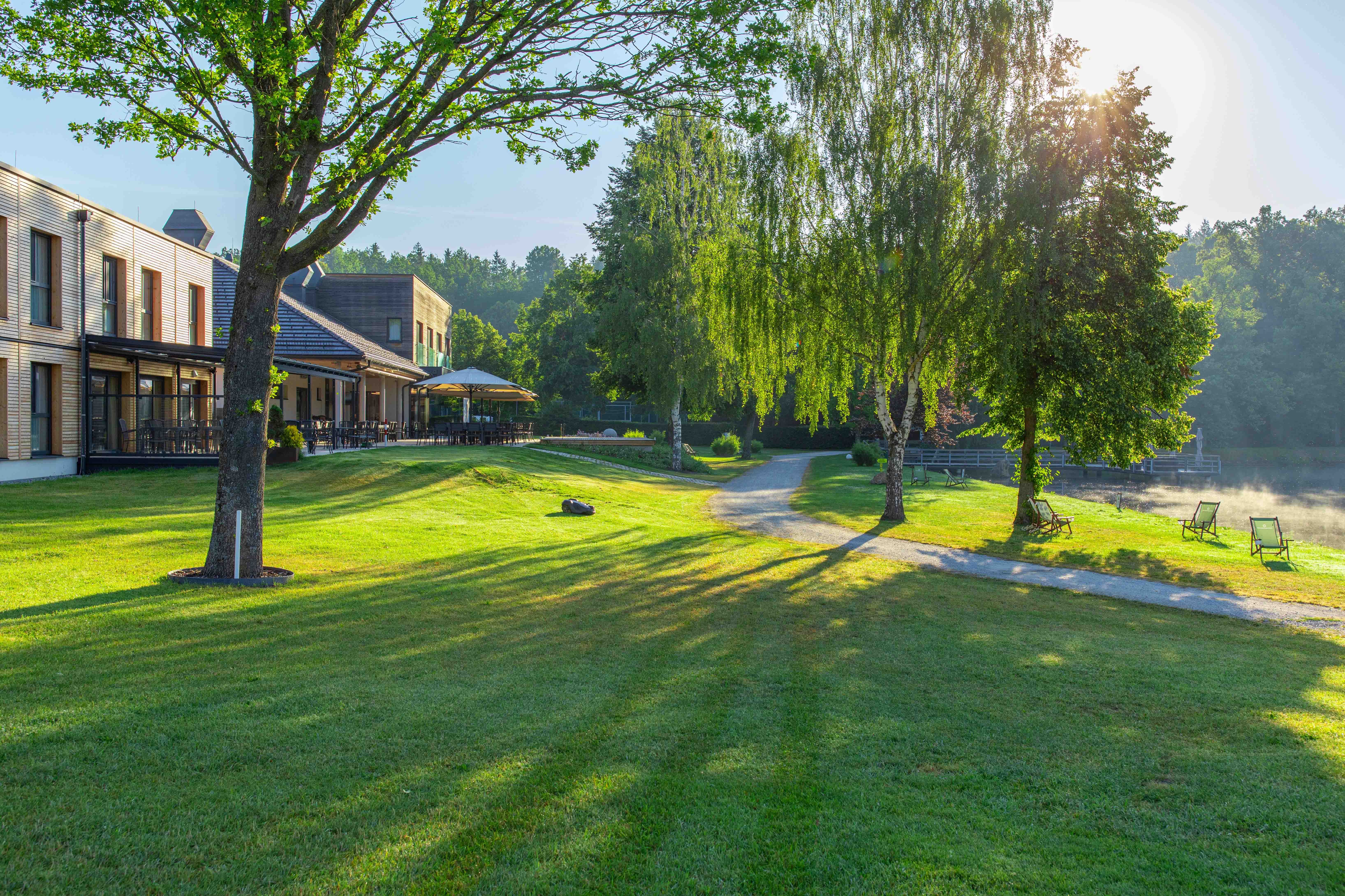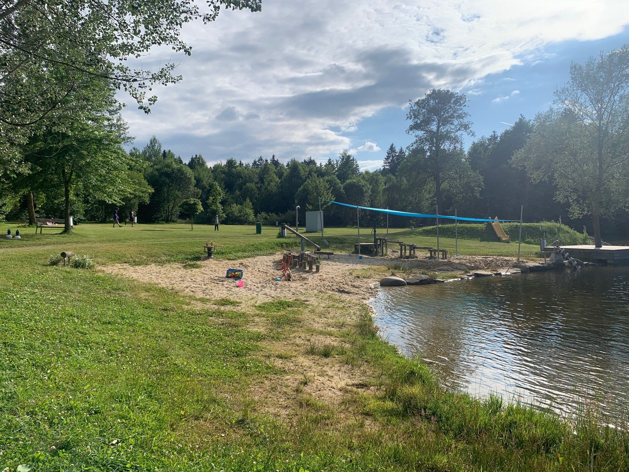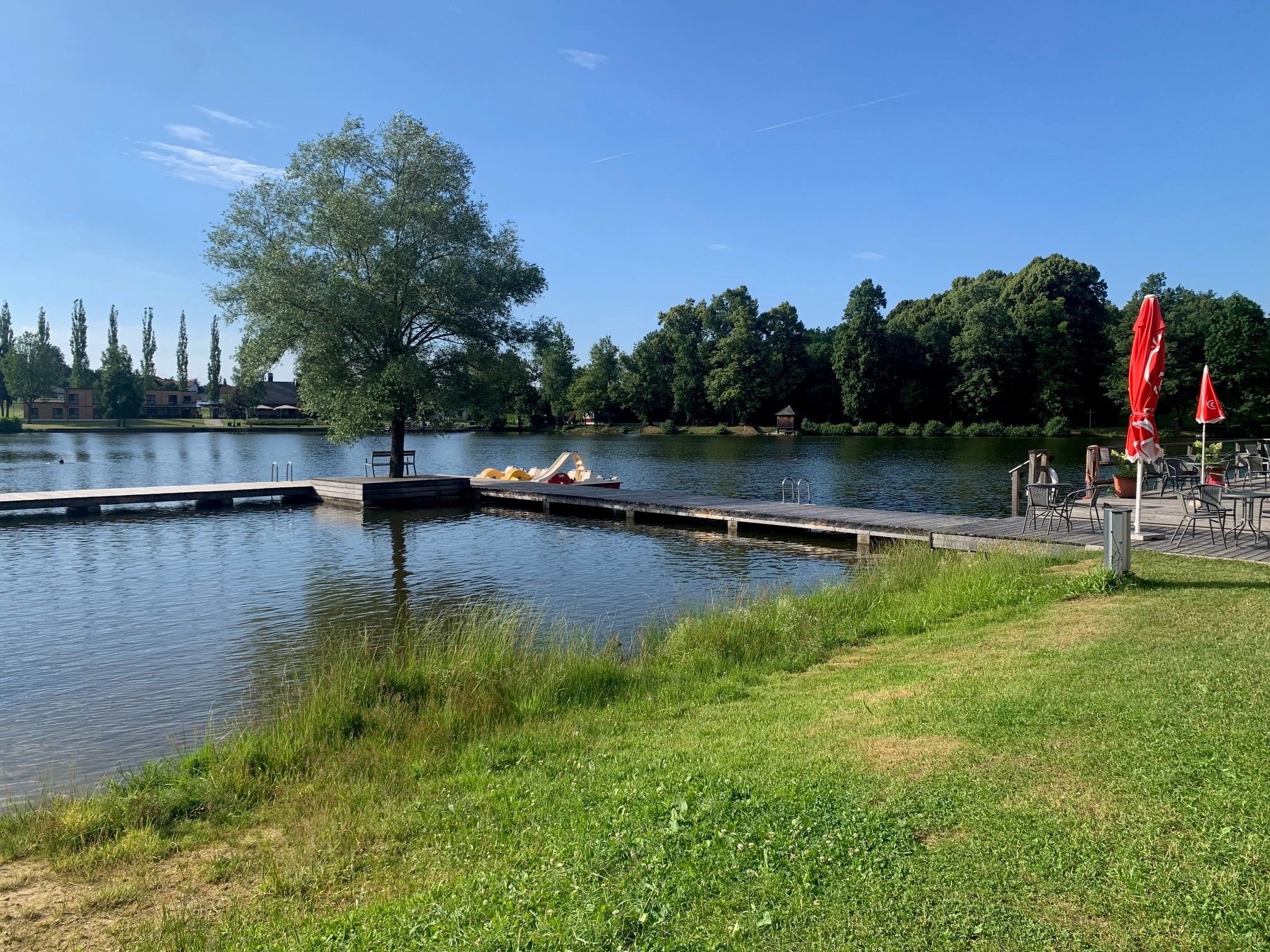 Auf der WaLaBad-Terrasse am Hausschachen Teich können Besucher Getränke, Eis oder kleinen Snacks in der Sonne genießen.