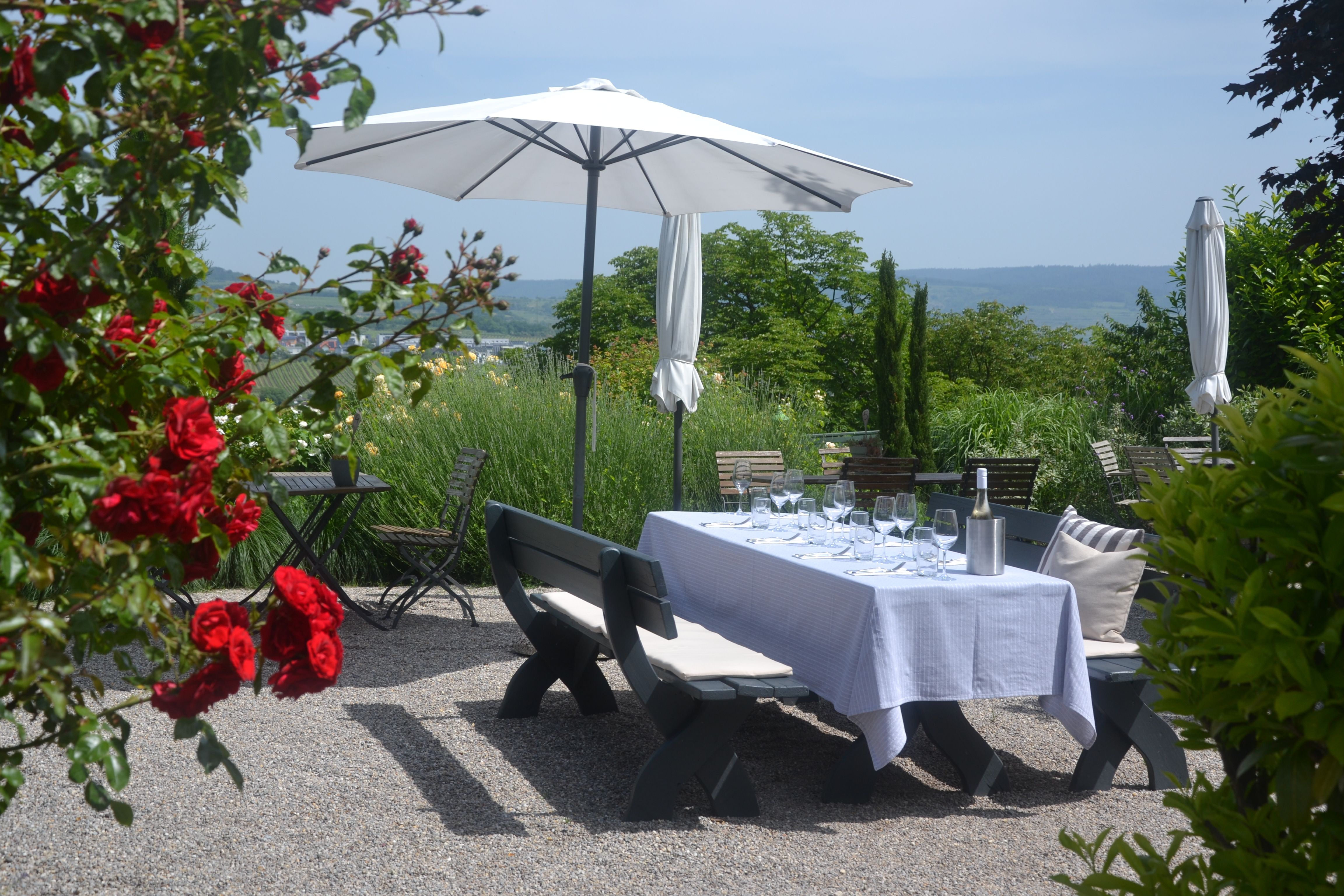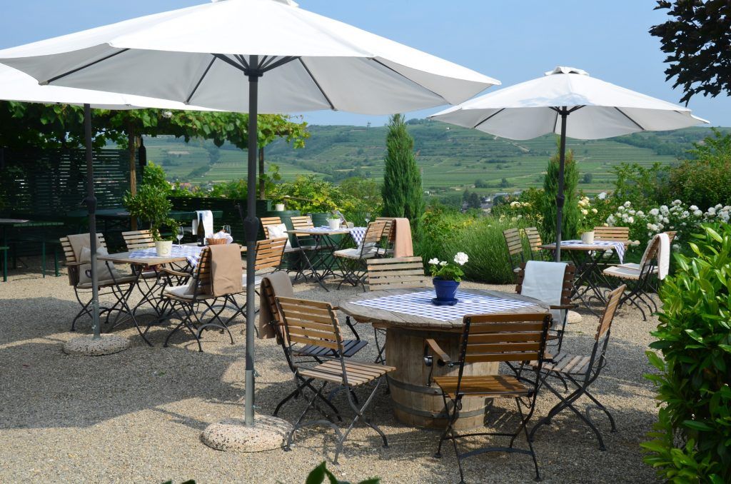 Bei schönem Wetter lädt der Gastgarten mit herrlichem Blick über die Weinstadt Langenlois zum Verweilen ein.