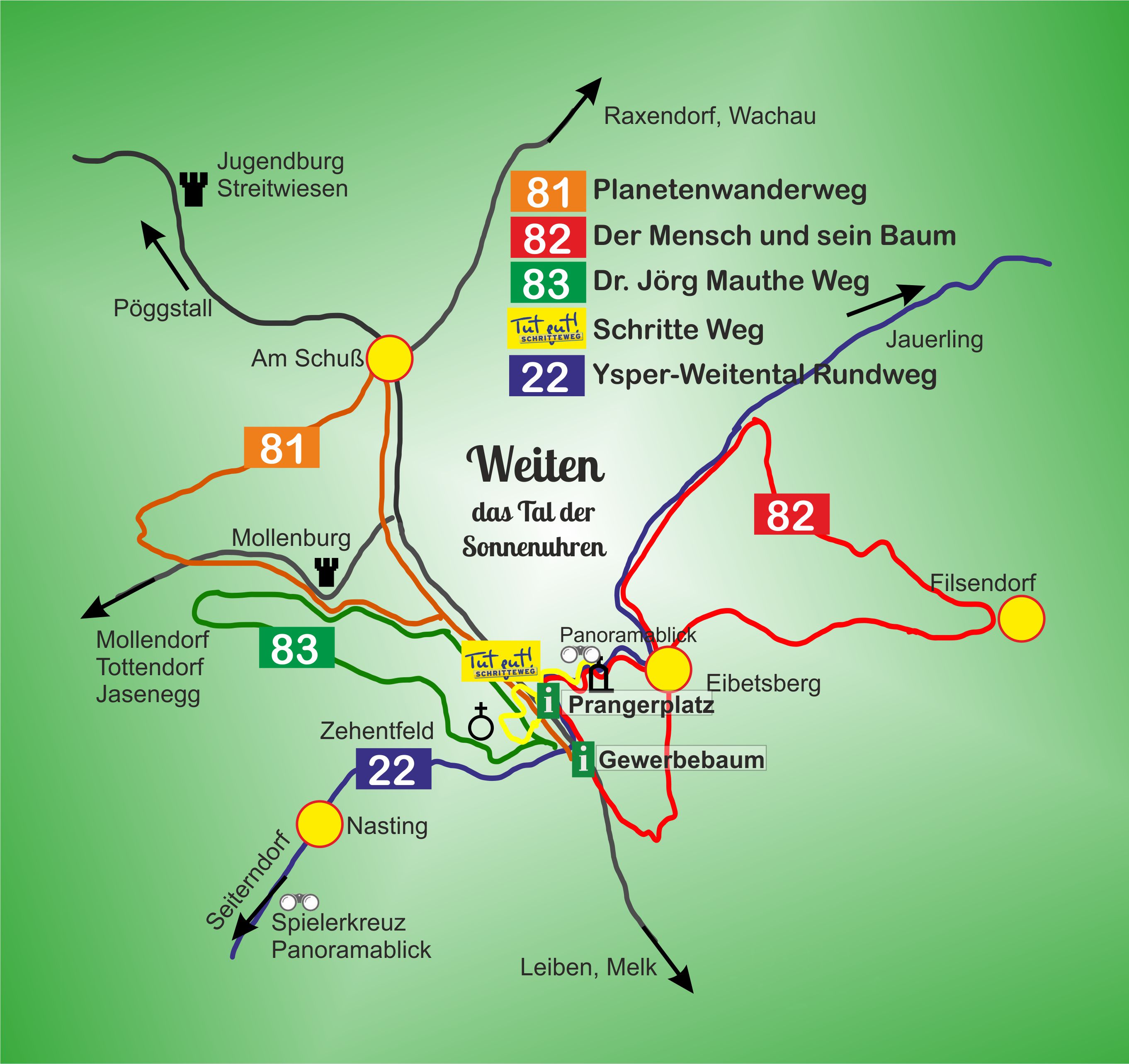 Urlaub im Tal der Sonnenuhren: Die Marktgemeinde Weiten im Bezirk Melk empfängt ihre Gäste mit würziger Luft, reich bewaldeten Hängen und gepflegten Wiesen-Landschaften. Eingebettet zwischen dem Jauerling (959 Meter) und dem Ostrong (1060 Meter) – den Höhenzügen des südlichen Waldviertels – liegt der Wohlfühl-Ort in einem der schönsten Täler Niederösterreichs: dem Ysper-Weitental, auch bekannt als "Tal der Sonnenuhren“. Idyllische Ausflugsziele und herrliche Wanderwege machen den Aufenthalt in Weiten zum unvergesslichen Familien-Erlebnis.