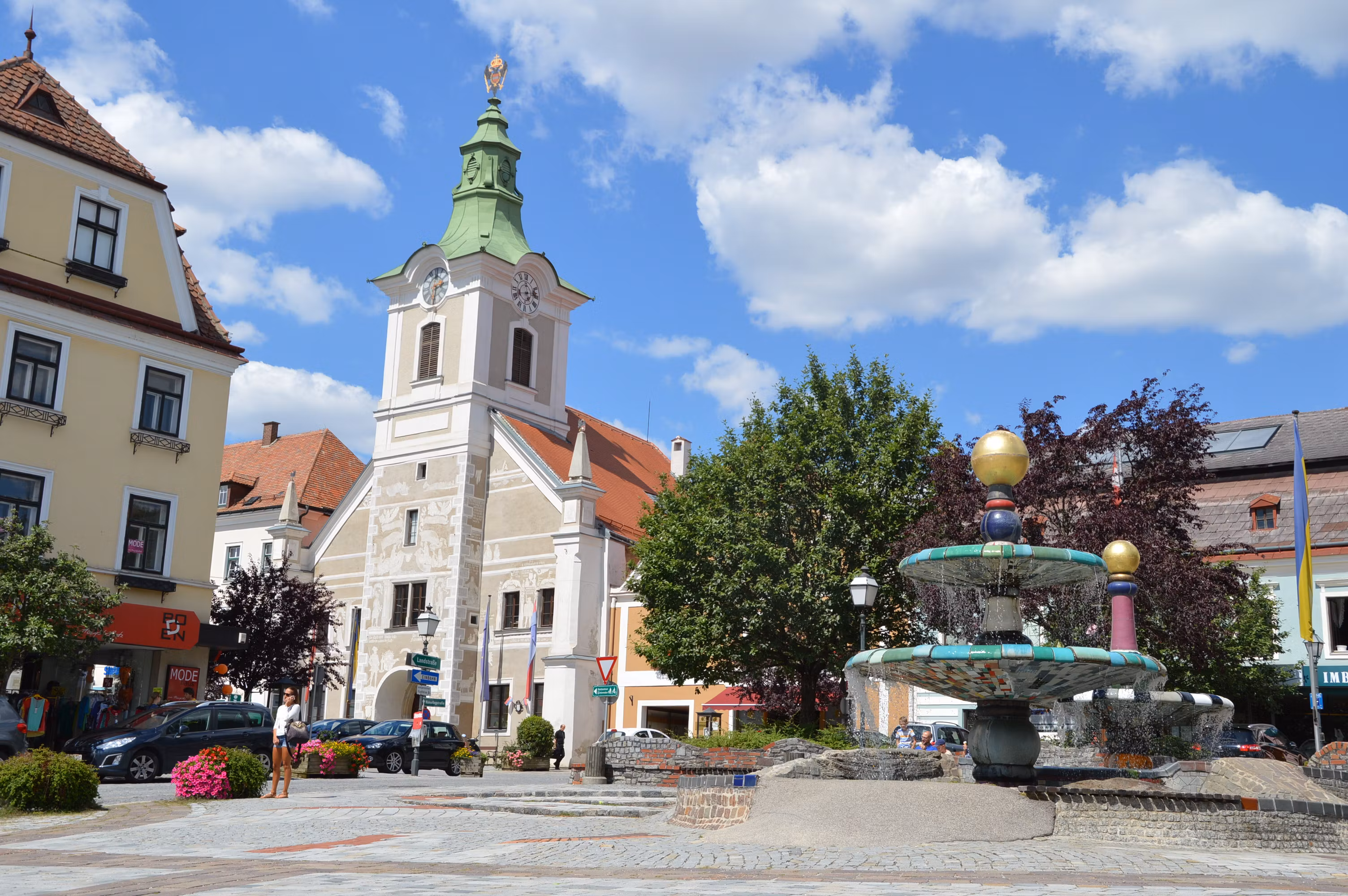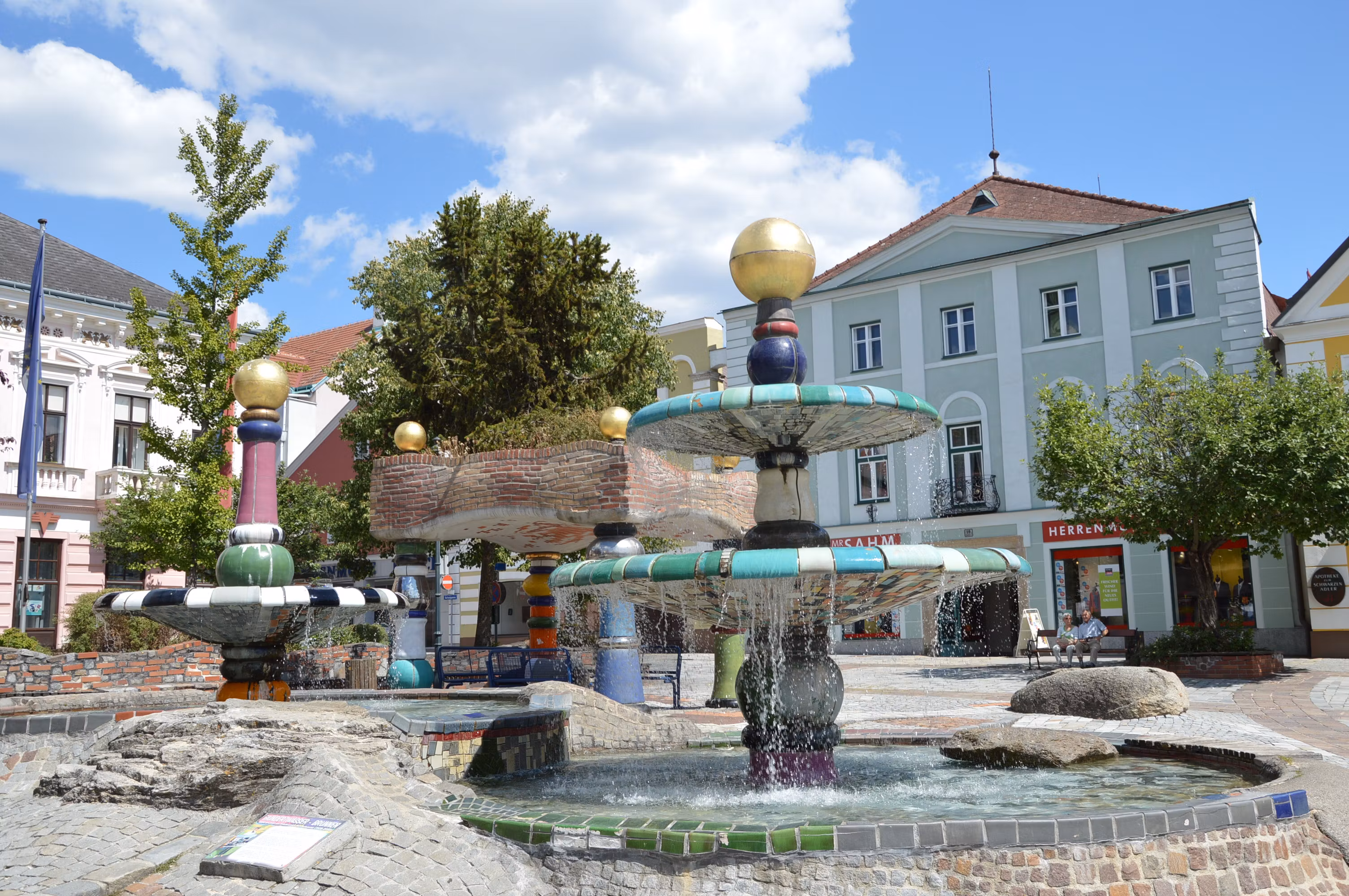 - der 1994 von Friedensreich Hundertwasser entworfene Hundertwasserbrunnen am Hauptplatz sowie