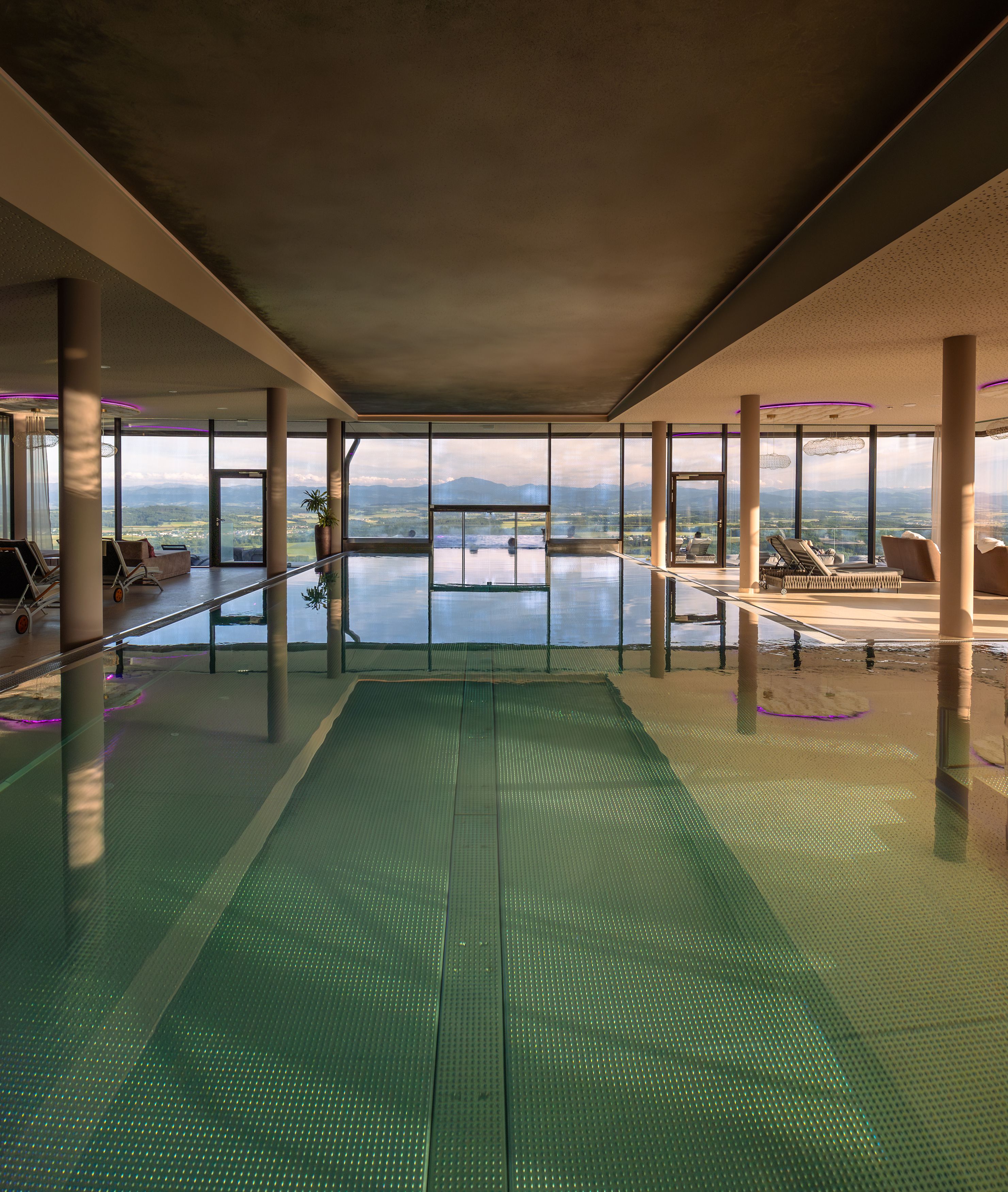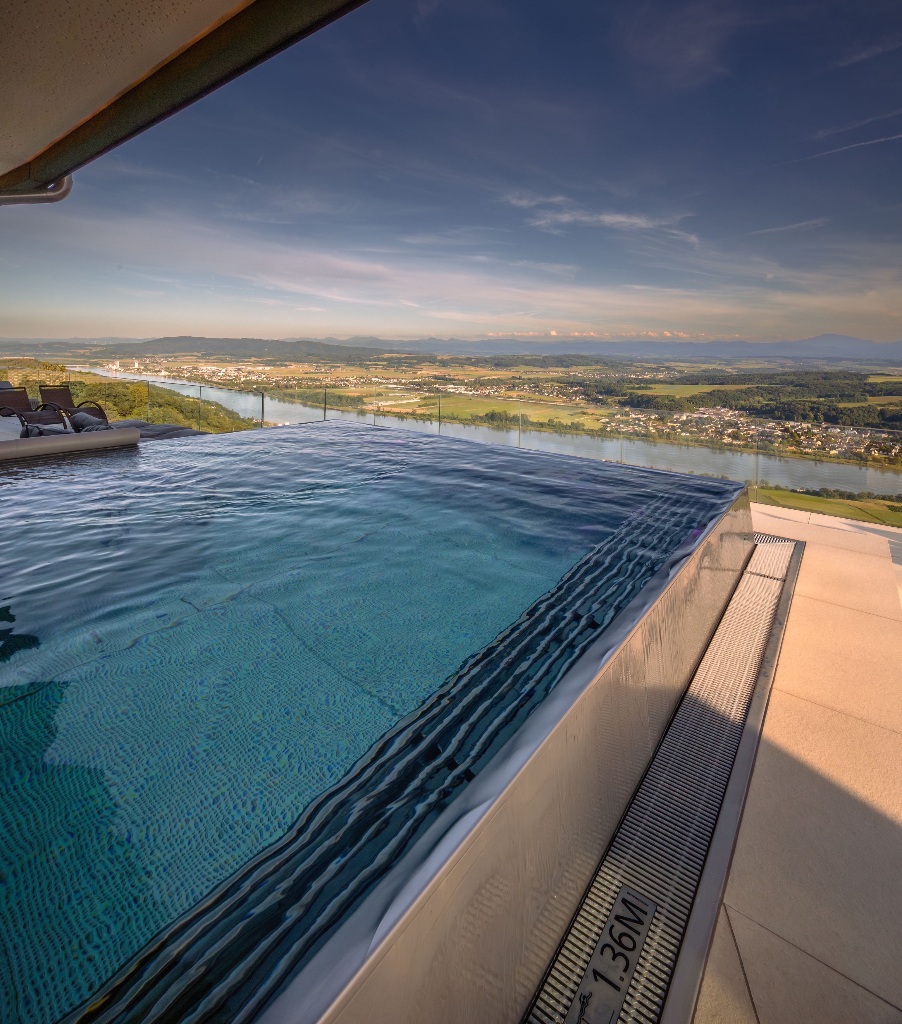 Zusätzlich zum grandiosen Infinity-Pool hat das hoteleigene „Wachauf-SPA“ noch einiges mehr zu bieten: verschiedene Saunen, Infrarotkabine, Sole-Dampfbad, Fitnessraum, Ruheraum, Sky-Lounge etc. Alles da.
