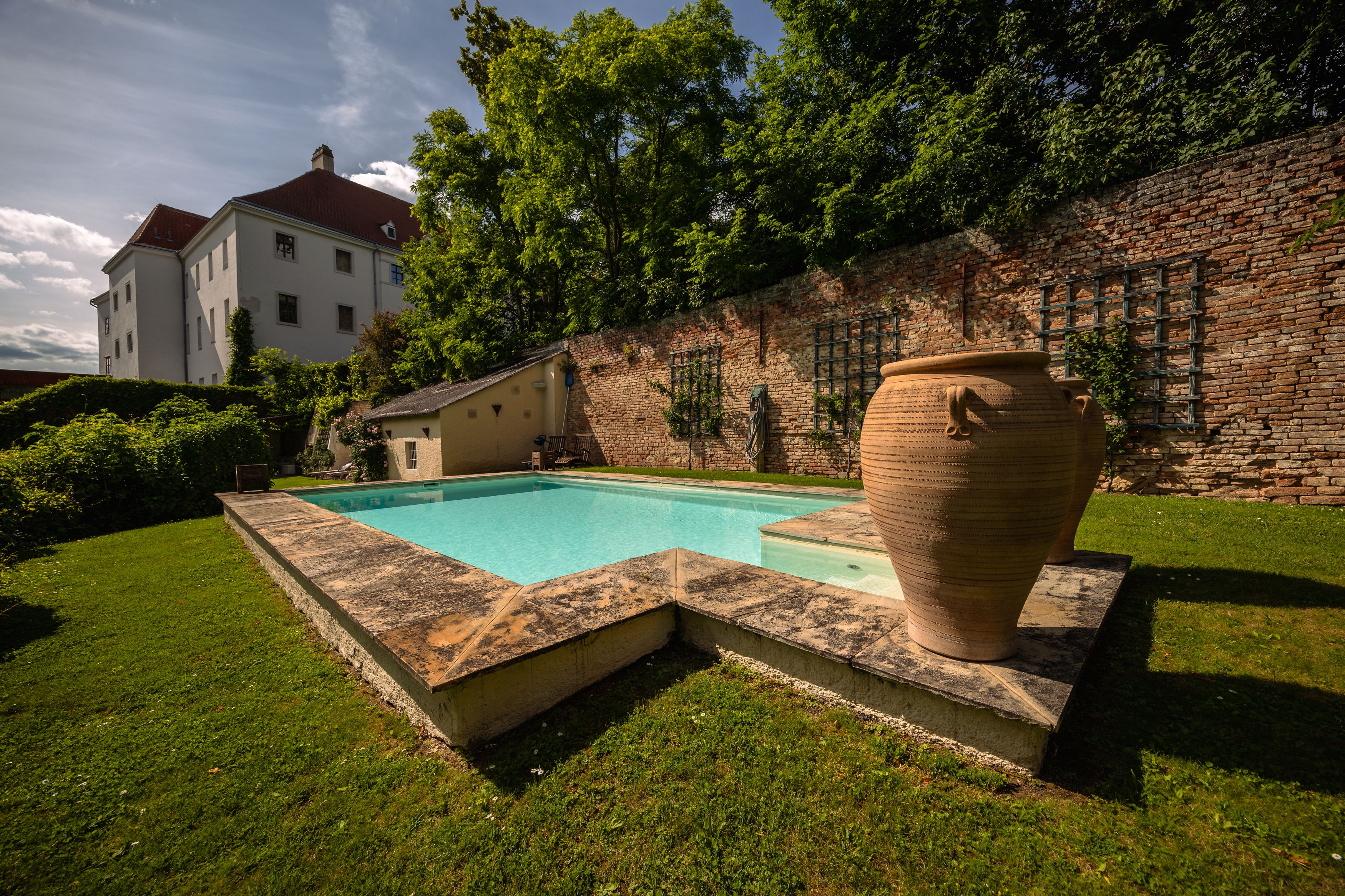 Inmitten einer wunderschönen Parkanlage, direkt in Horn, besitzt die Familie Graf Hoyos ein Schloss, dessen älteste Teile bis ins 12. Jahrhundert zurückreichen. Im neu sanierten Trakt stehen den Gästen vier luxuriöse Suiten mit großzügigem Wohnbereich und voll ausgestatteter Küche zur Verfügung. So oder so ähnlich könnte ein Urlaubstag dort aussehen: Nach einer erholsamen Nacht im Boxspringbett opulent frühstücken – mit Bio-Produkten aus eigener Herstellung wie Eiern der Schlossparkhühner und hausgemachtem Apfelsaft –, danach durch den 23 Hektar großen Schlosspark schlendern, ein wenig rasten, eine Partie Tennis spielen, in den Outdoor-Pool springen, sich in die privaten Gemächer zurückziehen, gut essen und den Tag in Ruhe ausklingen lassen.