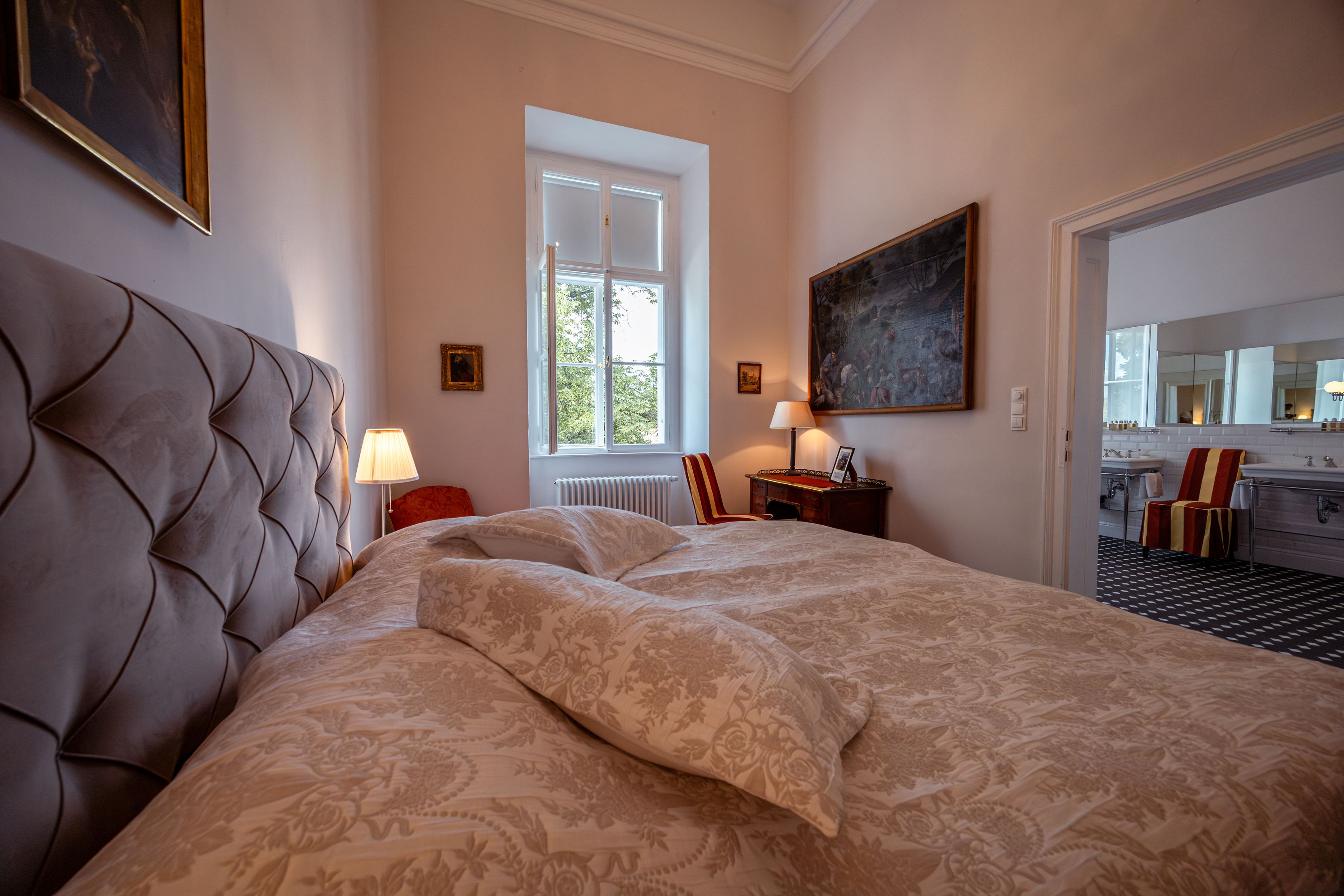 Der neu sanierte Schlosstrakt steht exklusiv als Gesamtes zur Verfügung und bietet so einen idealen Aufenthalt mit Familie oder Freundinnen. Mit Blick auf den weitläufigen Schlosspark verbindet dieser historische Charme mit modernem Wohnkomfort. Ein Rückzugsort, der Raum, Ruhe und besondere Momente ermöglicht.