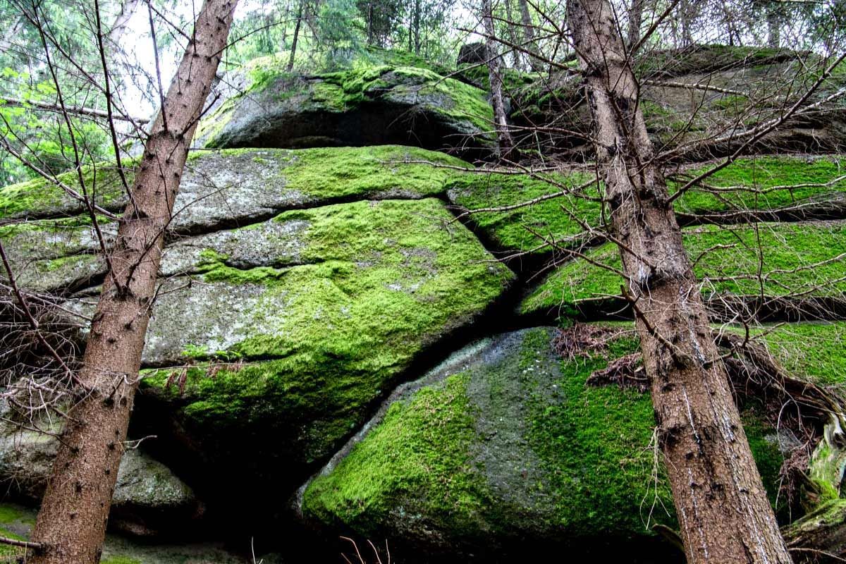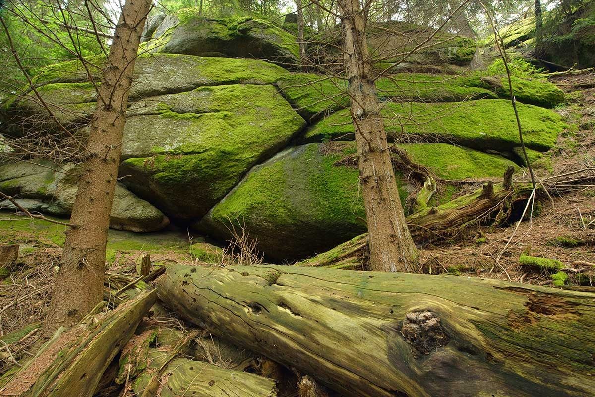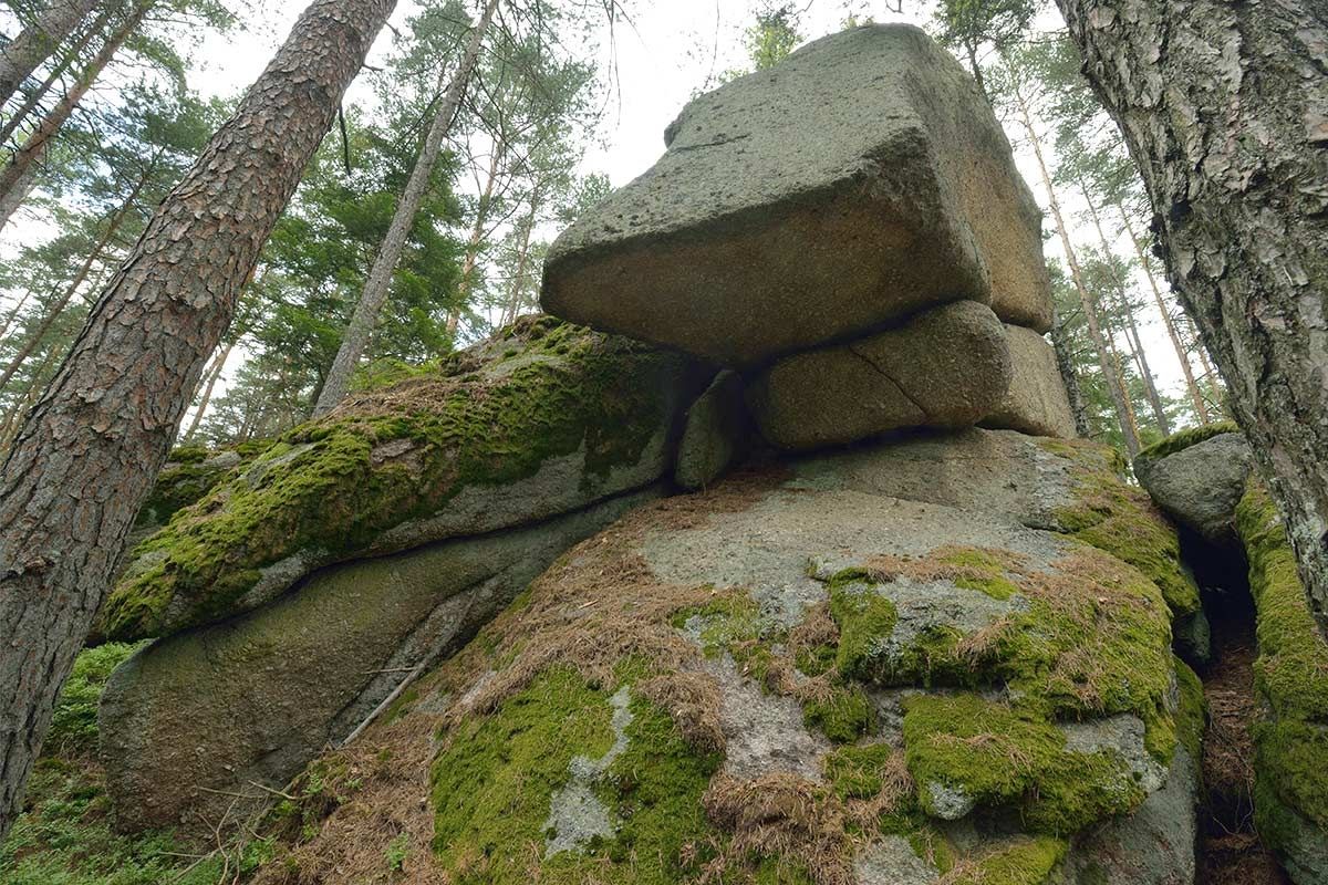 "Fichtenschluff", "Pilzstein", “Steinerner Torbogen”, "Wuchtelstein", "Gletschermühle" heißen die bizarren Felsformationen, die wirklich sehenswert sind. Der "Steinere Torbogen" ist eine überaus seltene geologische Erscheinung, weil Torbögen normalerweise eher im Kalkgebirge anzutreffen sind. Der Granit-Steinbogen erstreckt sich zwischen zwei großen Felsblöcken. Man kann unten durch und oben drüber gehen. Vom Torbogen blickt man auf den “Wuchtelstein” hinab, der so aussieht, wie er heißt. Die "Gletschermühle" ist ein ca. 12 m hoher Granitturm mit eigentümlichen, muldenartigen Eintiefungen, die an eine Gletschermühle erinnern. Mit der Eiszeit hat die Felsformation aber nichts zu tun: Die bizarren Granit-Formen entstanden durch Auswitterung des über 350 Millionen Jahre alten Urgesteinmassivs. (“Echte” Gletschermühlen sind durch Schmelzwasser gebildete, spiralförmige Hohlformen im Eis.)