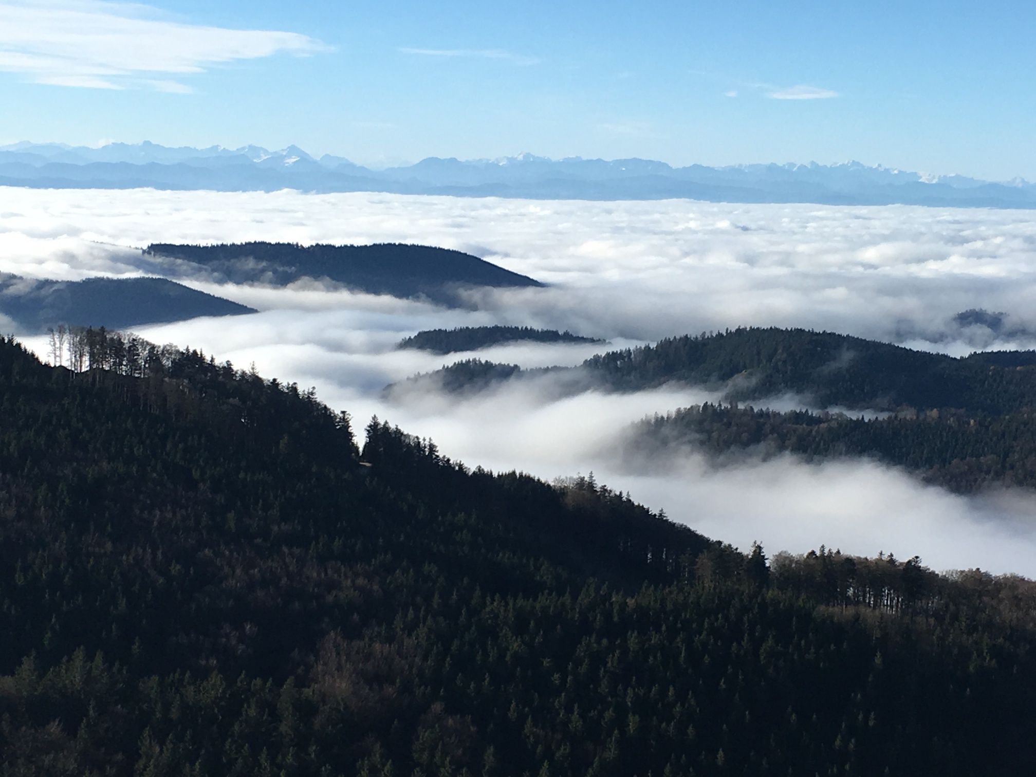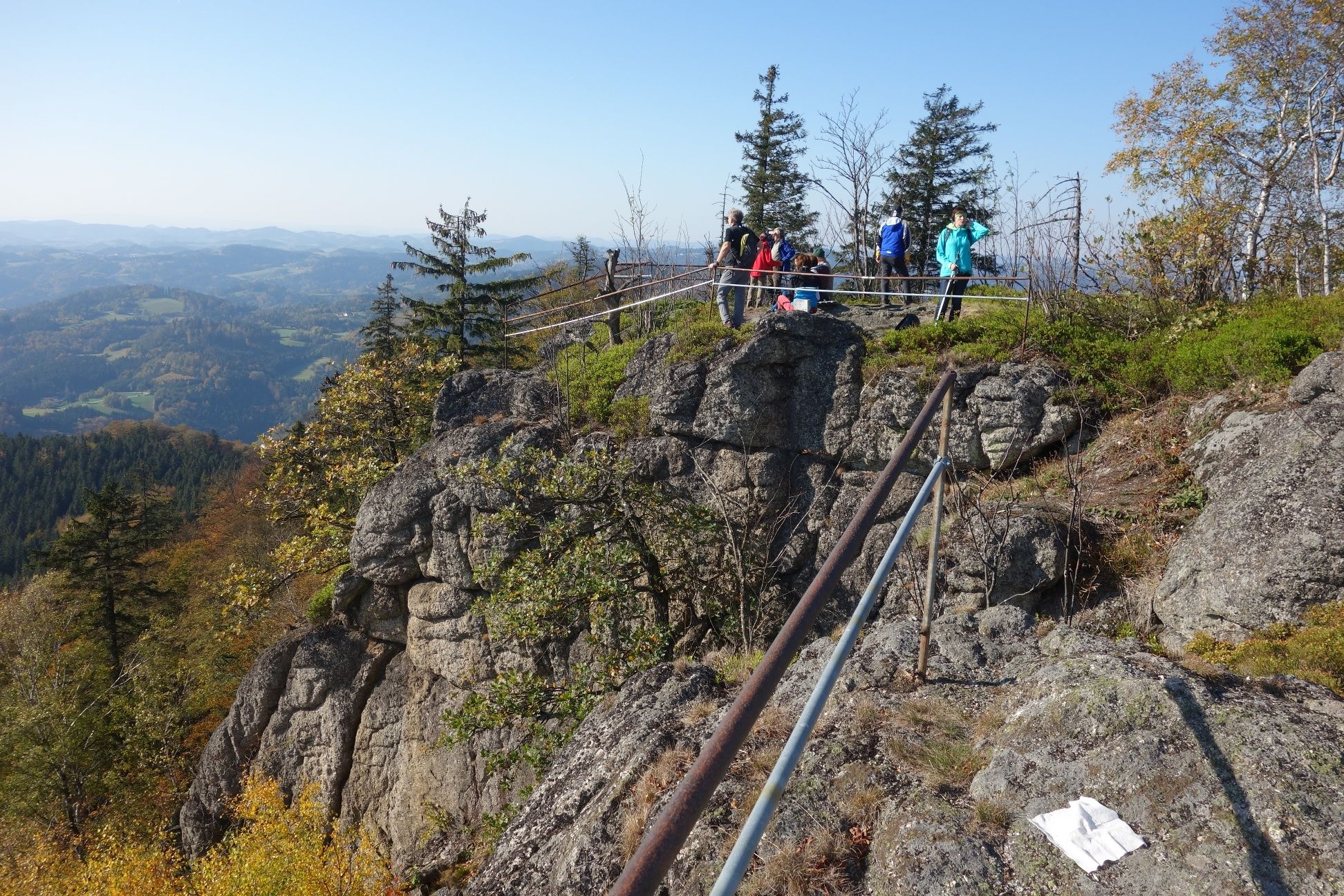 Gesicherte Aussichtspunkt mit Gipfelkreuz und Gipfelbuch, herrlicher Alpenblick.