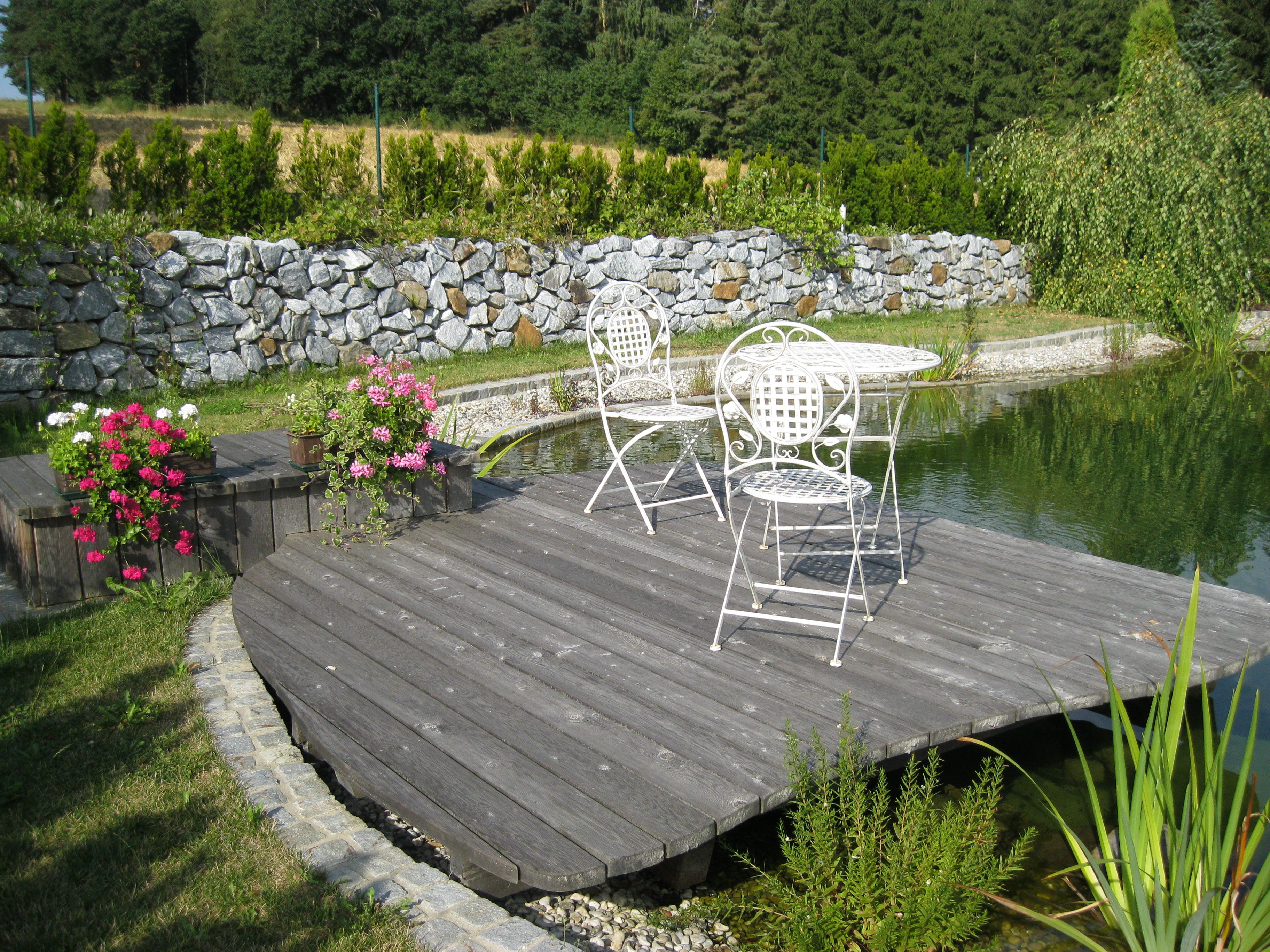 Ein natürlicher Schwimmteich mit Holzsteg und bunten Kugeln auf dem Rasen.