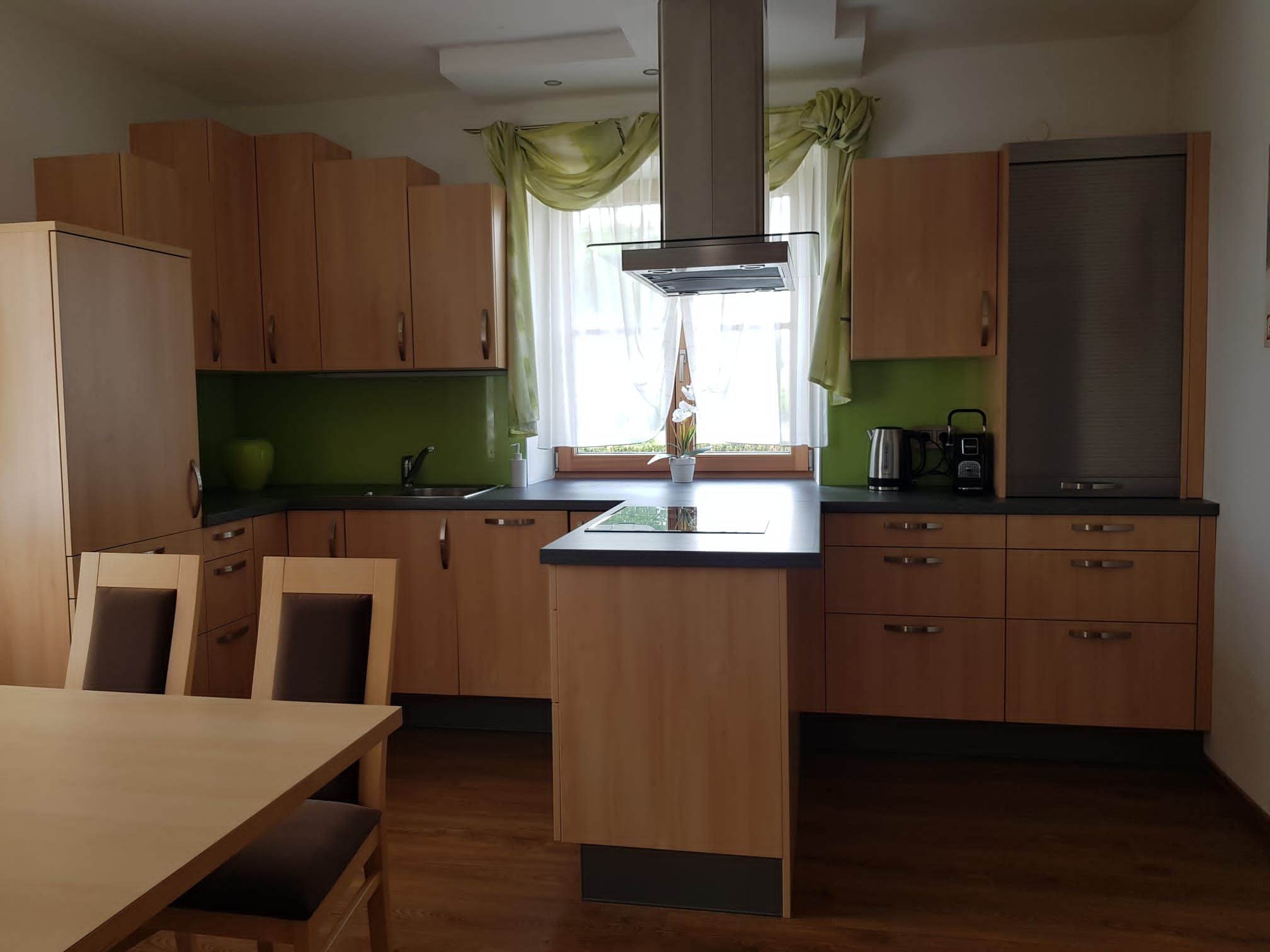 Kühlschrank mit Gefrierfach, 4 Kochfelder + Dunstabzug, Backrohr, Geschirrspüler, Mikrowelle, Toaster, Wasserkocher, Kapsel-Kaffeemaschine + Kapseln (Kapselpreis 30 Cent), Handstaubsauger, Ess- u. Kaffeegeschirr, Ess- u. Kaffeebesteck, Schüsseln, Gläser, Töpfe u. Pfannen, Kochbesteck, Schneidbretter, Küchenmesser, Geschirrspülmittel, Geschirrtücher, Müllsäcke