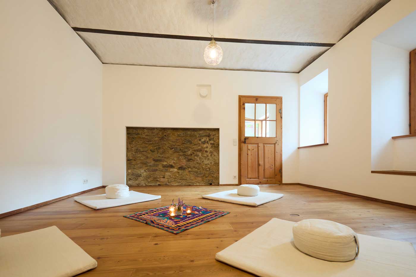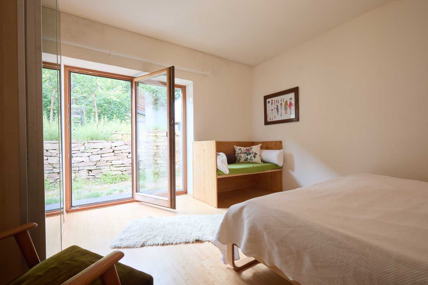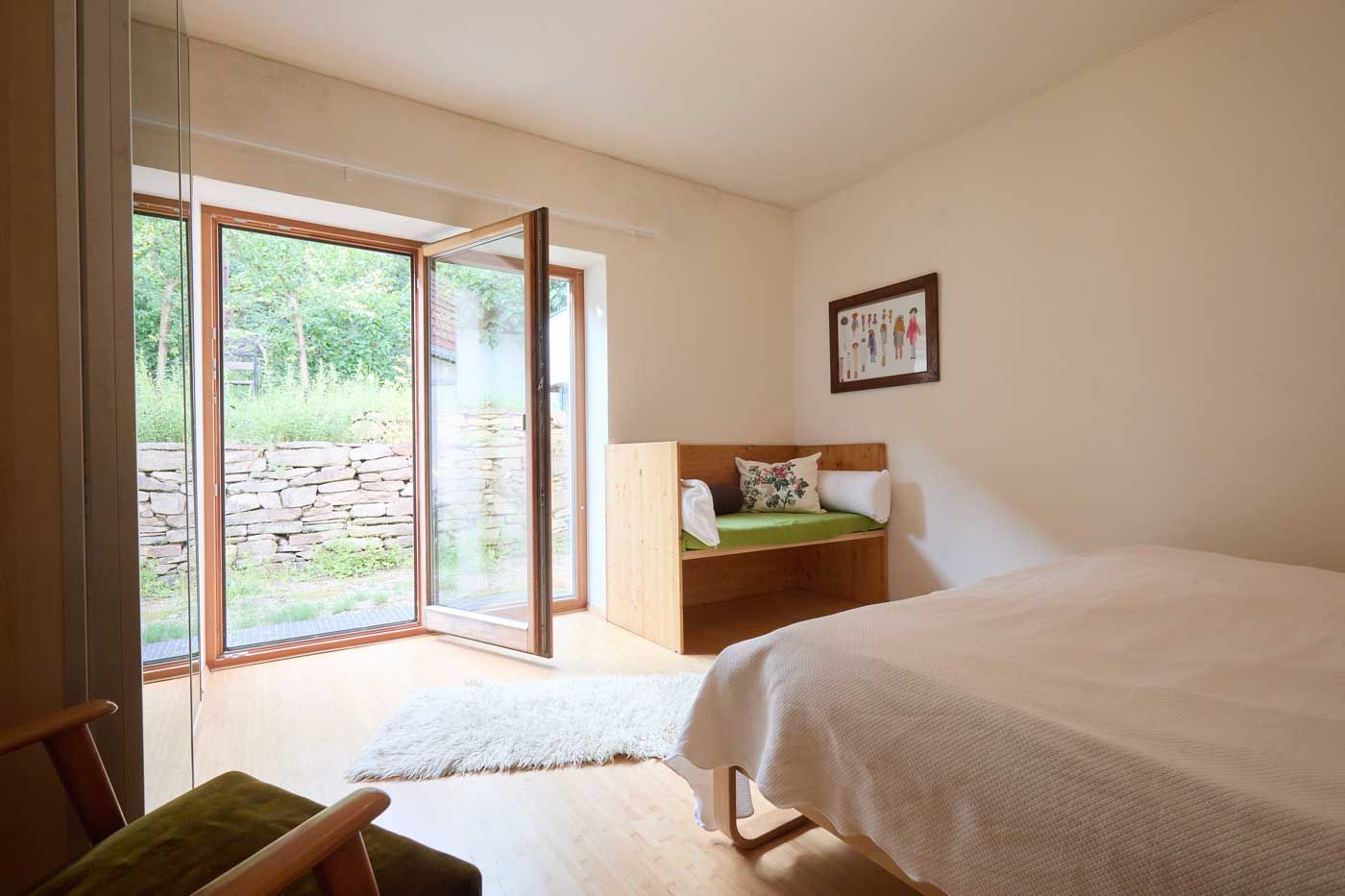 Das Haus eignet sich besonders gut für Familien mit Kindern sowie für Menschen, die einen gemeinsamen Ort der Stille und zur Meditation suchen. In den drei Schlafräumen mit je einem Doppelbett können bis zu sechs Personen übernachten, zusätzlich im leeren Raum noch bis zu zwei Personen (auf Matratzen auf dem Boden). Die Räume sind mit Lehmputz verputzt, was auch im heißen Hochsommer ein angenehmes Raumklima schafft. Der Innenhof, das Haus und weite Teile des Gartens sind nicht einsehbar, gleichzeitig hat man selbst einen Ausblick in eine Streuobstwiese.
