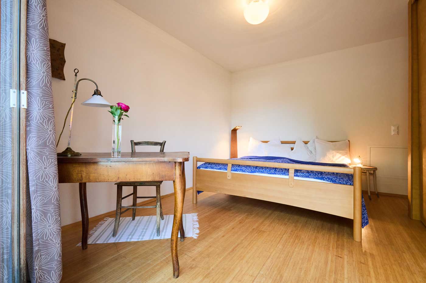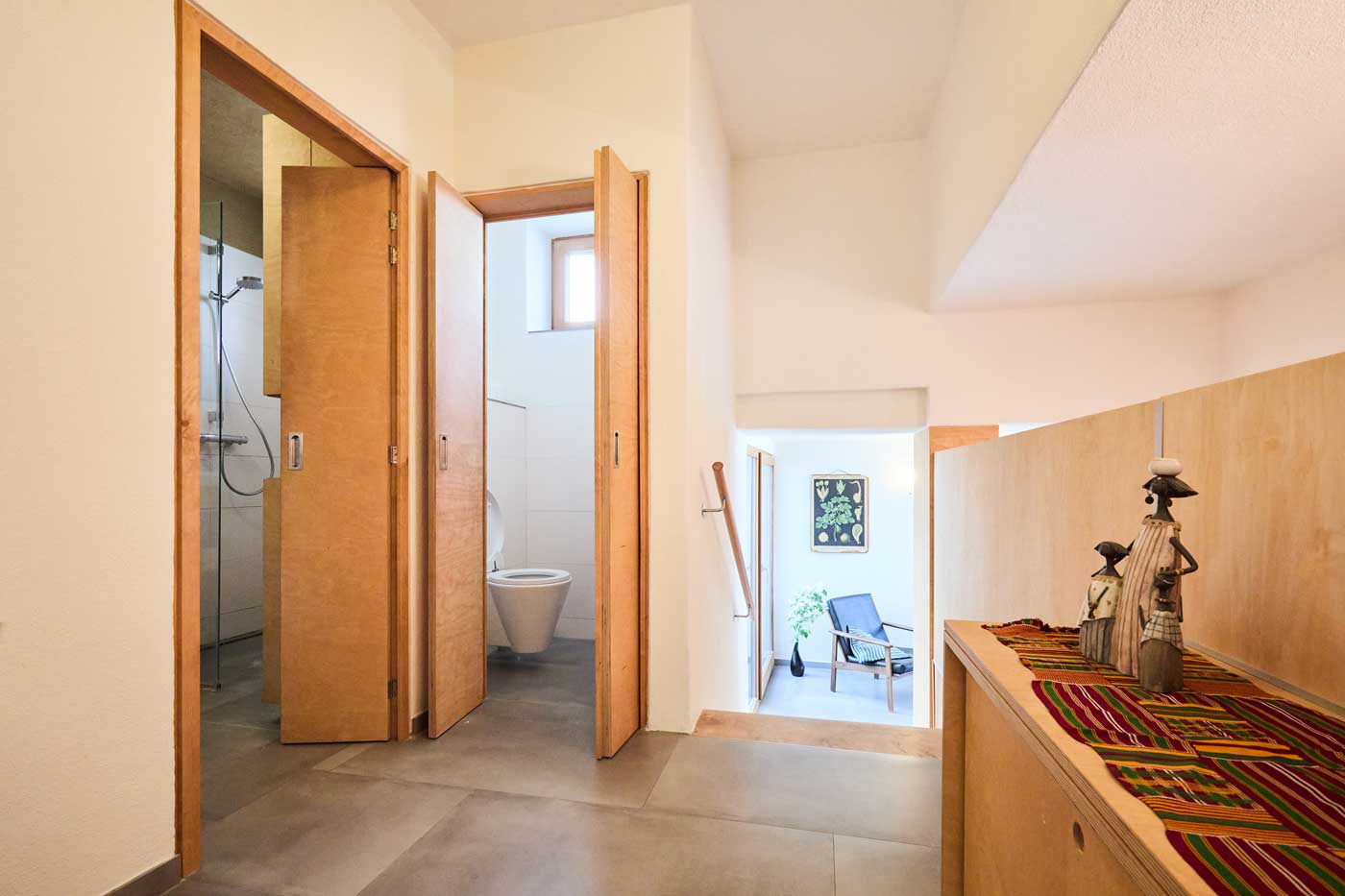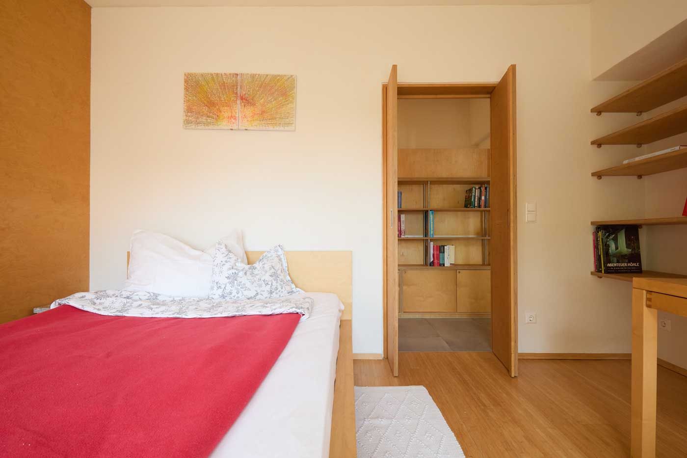 Das Haus eignet sich besonders gut für Familien mit Kindern sowie für Menschen, die einen gemeinsamen Ort der Stille und zur Meditation suchen. In den drei Schlafräumen mit je einem Doppelbett können bis zu sechs Personen übernachten, zusätzlich im leeren Raum noch bis zu zwei Personen (auf Matratzen auf dem Boden). Die Räume sind mit Lehmputz verputzt, was auch im heißen Hochsommer ein angenehmes Raumklima schafft. Der Innenhof, das Haus und weite Teile des Gartens sind nicht einsehbar, gleichzeitig hat man selbst einen Ausblick in eine Streuobstwiese.