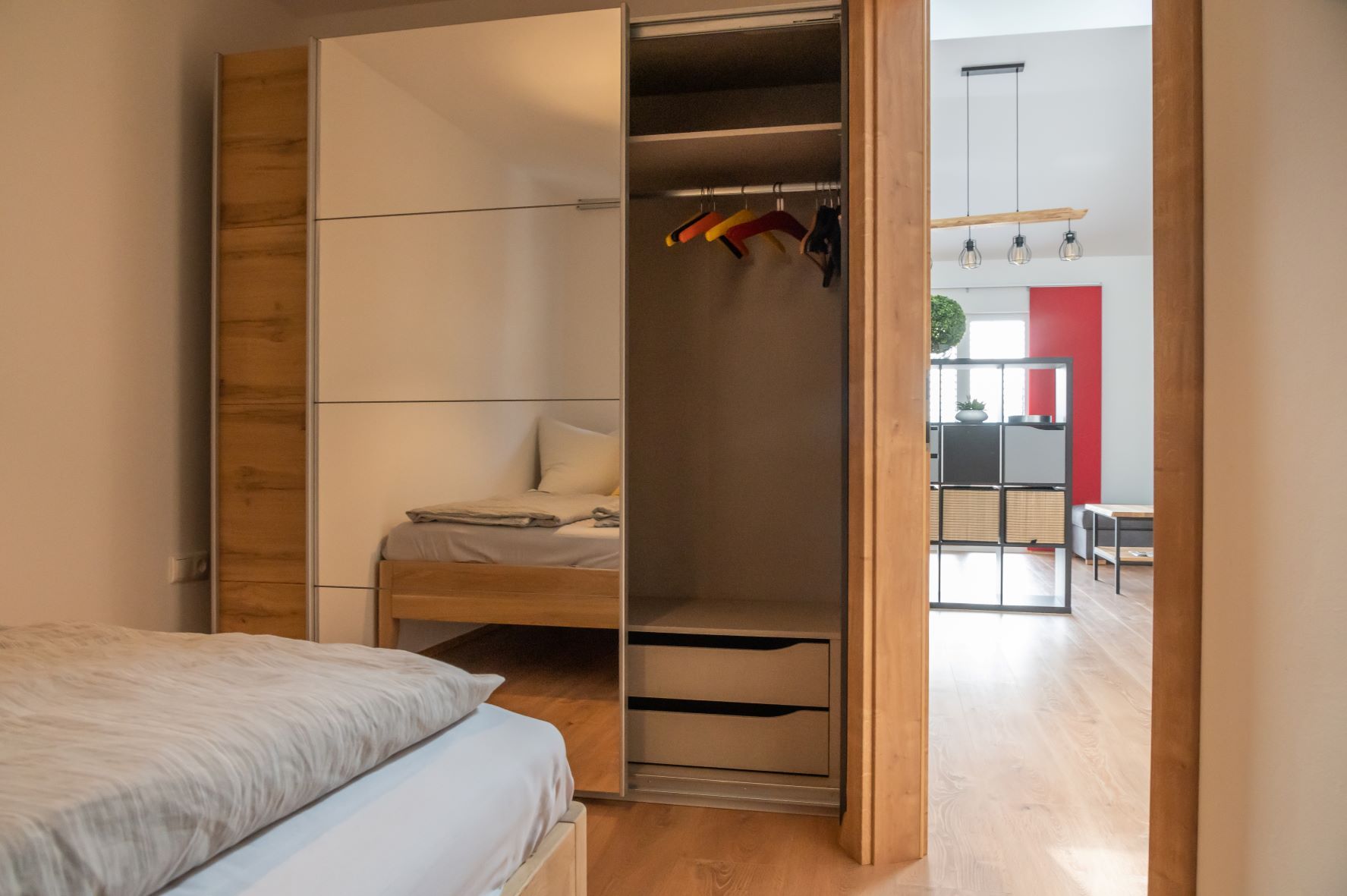 Das Schlafzimmer hält ein Doppelbett und einen Schiebetürenschrank für Sie bereit. Entspannen Sie auf der Couch oder nutzen Sie sie als weitere Schlafmöglichkeit für zwei Personen.
