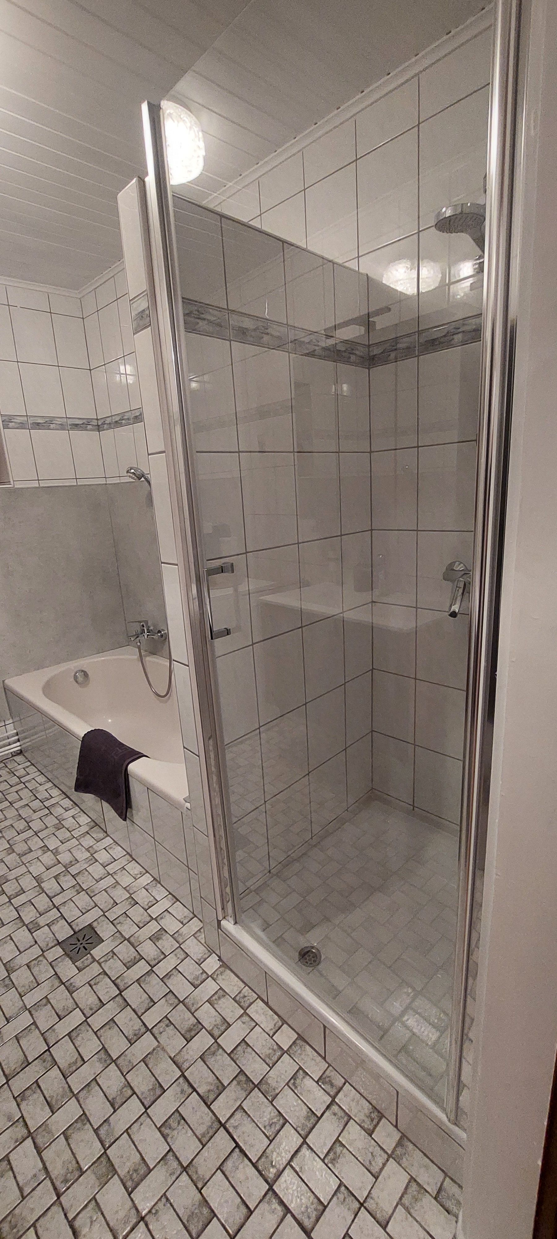 Das Badezimmer ist ausgestattet mit Badewanne, Dusche und Waschmaschine, getrennt vom WC.