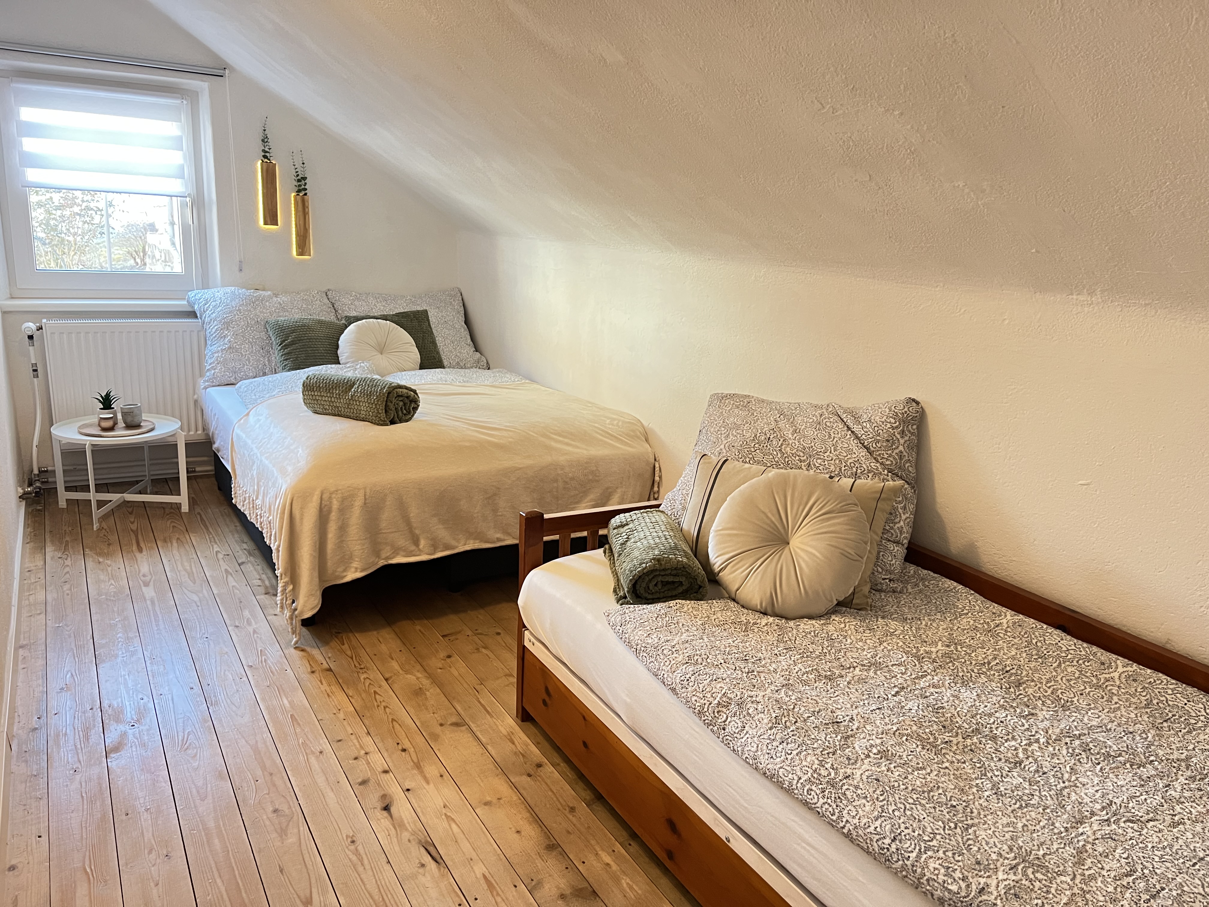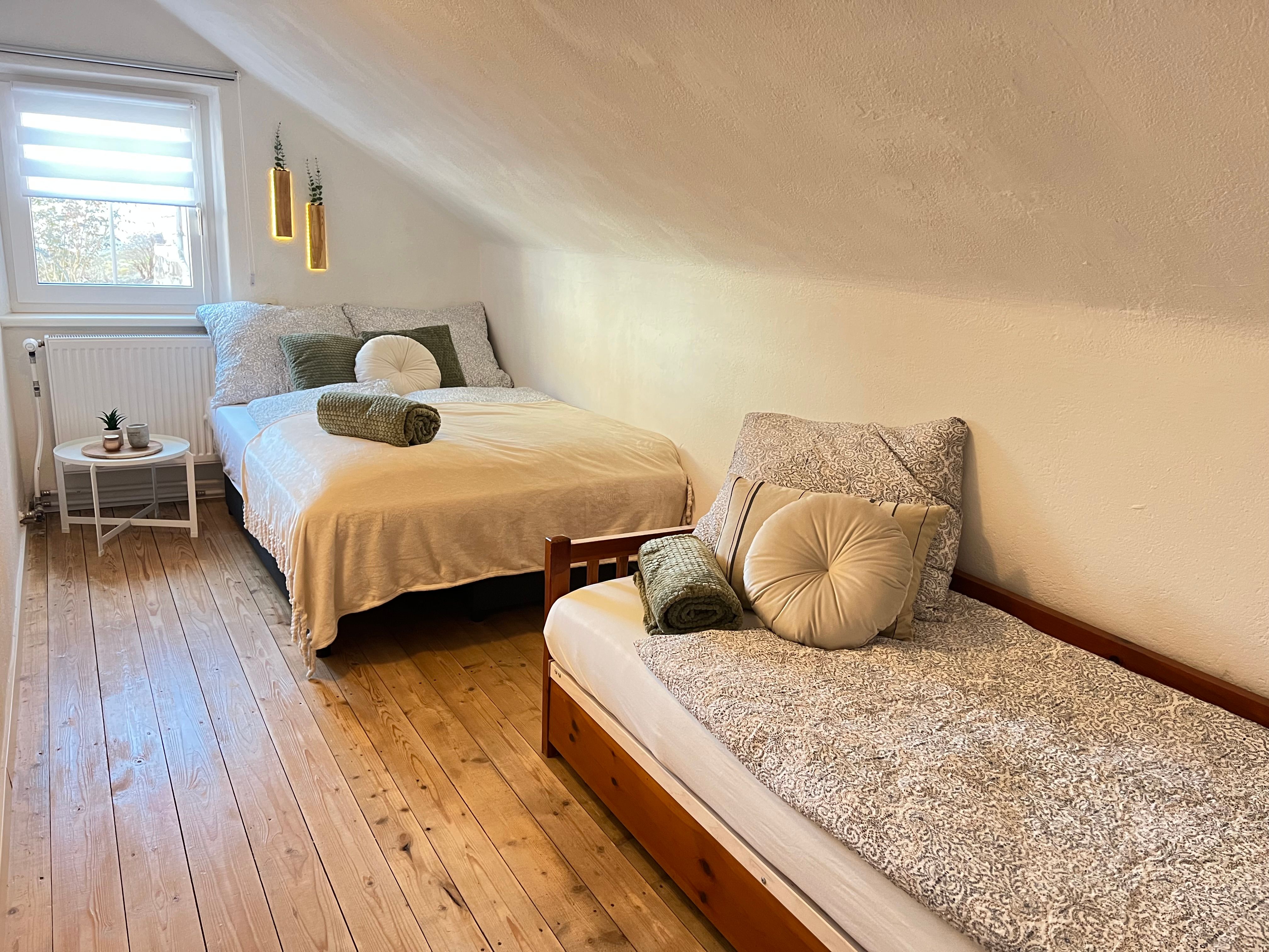 2. Appartement (60m2), plus Kabinett (70m2) im 1. Stock für 2-6 Personen, Doppelbett (180cm), Schlafsofa (140cm), Kabinett: Schlafsofa (140cm) Einzelbett (90cm) mit Bettwäsche, Küche komplett ausgestattet, Badezimmer mit WC, inkl. Badetücher, Föhn etc.