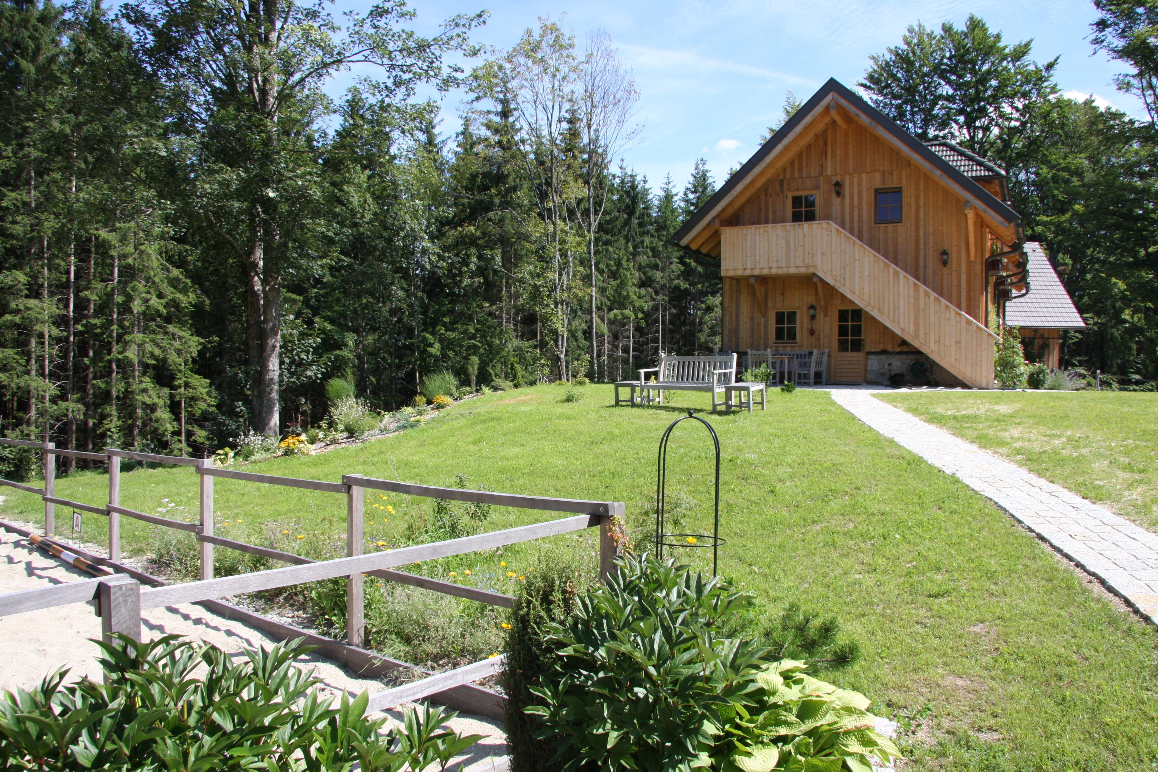 In unserer großen Gartenanlage steht Ihnen im Sommer ein beheiztes Schwimmbad zur Verfügung. Sie können gerne unsere Liegestühle, Essplätze, Grill- und Lager-Feuerplätze genießen. Es gibt einen Garten mit frischem Salat, Beeren und Kräutern. Unser kleiner Teich lädt Sie ein, ein Buch zu lesen oder das Treiben der Libellen zu beobachten. Sie können auch eine Runde mit dem kleinen Ruderboot drehen. Unsere Pferde freuen sich darauf sie kennen zu lernen. Wir haben einen sehr gepflegten Reitplatz.