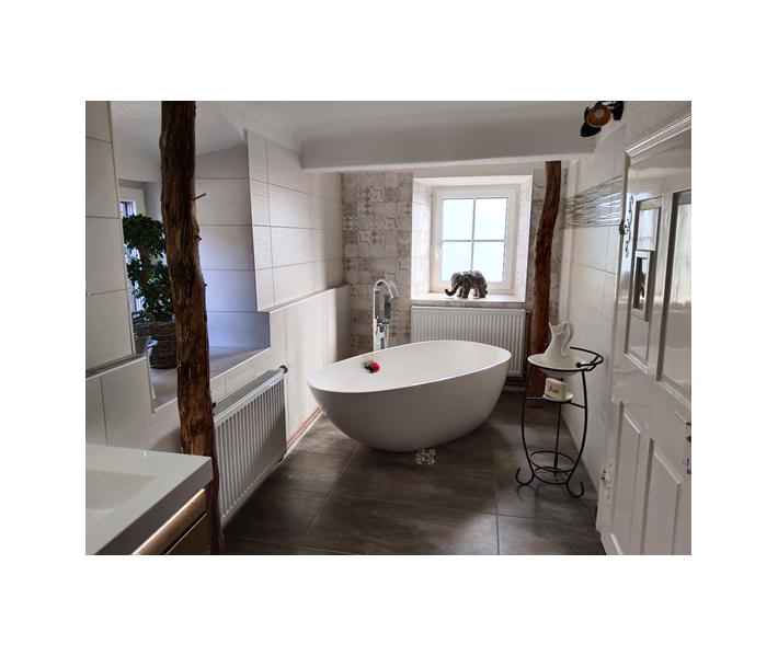 Bad: Badewanne, Waschbecken, Waschmaschine, Fön, Handtücher