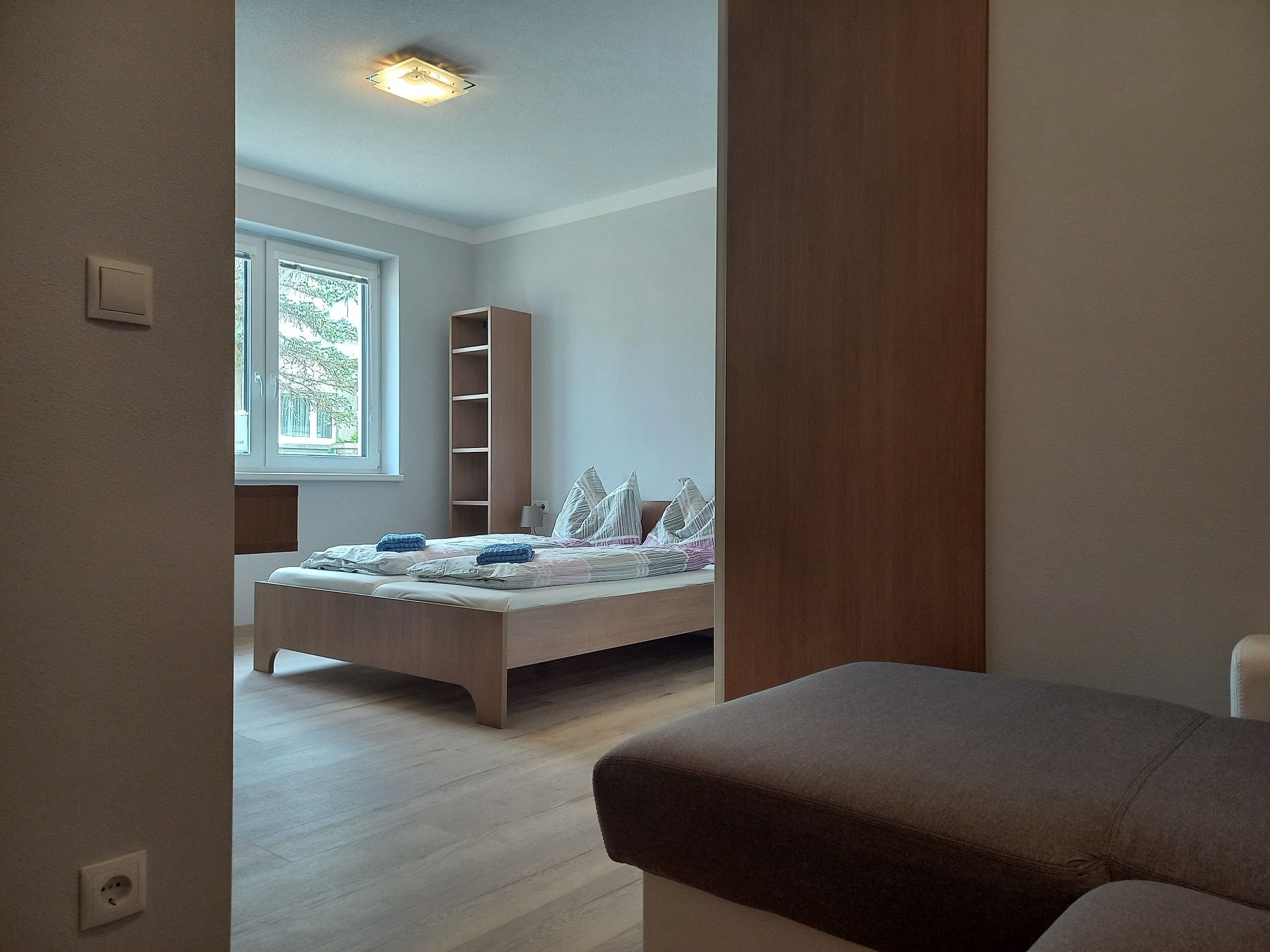 Wir bieten Ihnen zwei komfortable und neue Zimmer mit Doppelbett (ein Zimmer in der Ausführung Zweibettzimmer auf Wunsch möglich / ein Zimmer verfügt zusätzlich über eine bequeme Ausziehcouch für 1-2 Personen), eigenem Badezimmer und WC im Umfeld eines modernen Hauses (Eröffnung 2023). Das Zimmer verfügt weiters über TV (SAT-Programme) und kostenfreies W-LAN. Für die Dauer des Aufenthalts werden Ihnen selbstverständlich Handtücher zur Verfügung gestellt. Außerdem befindet sich im Zimmer auch ein Kühlschrank.