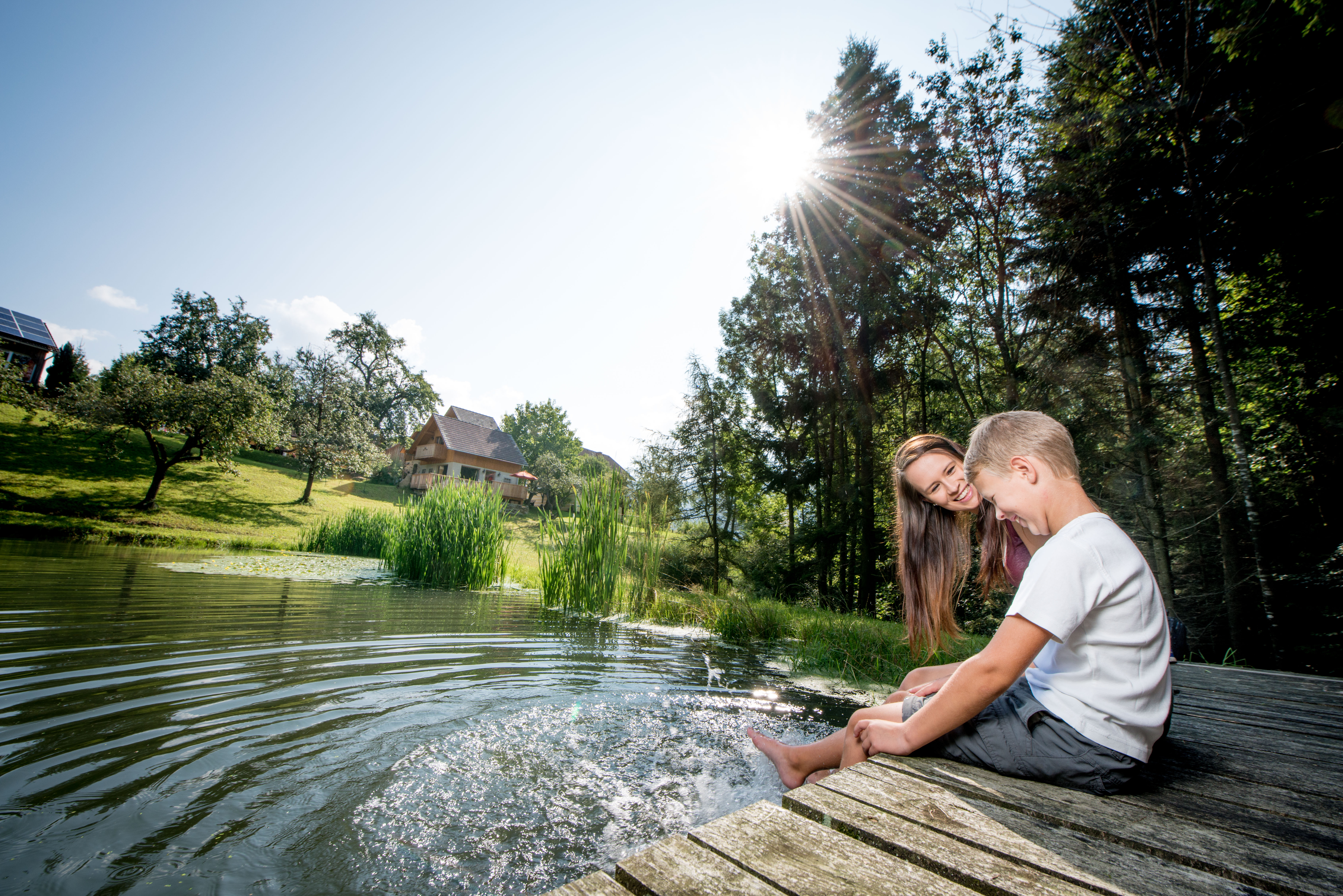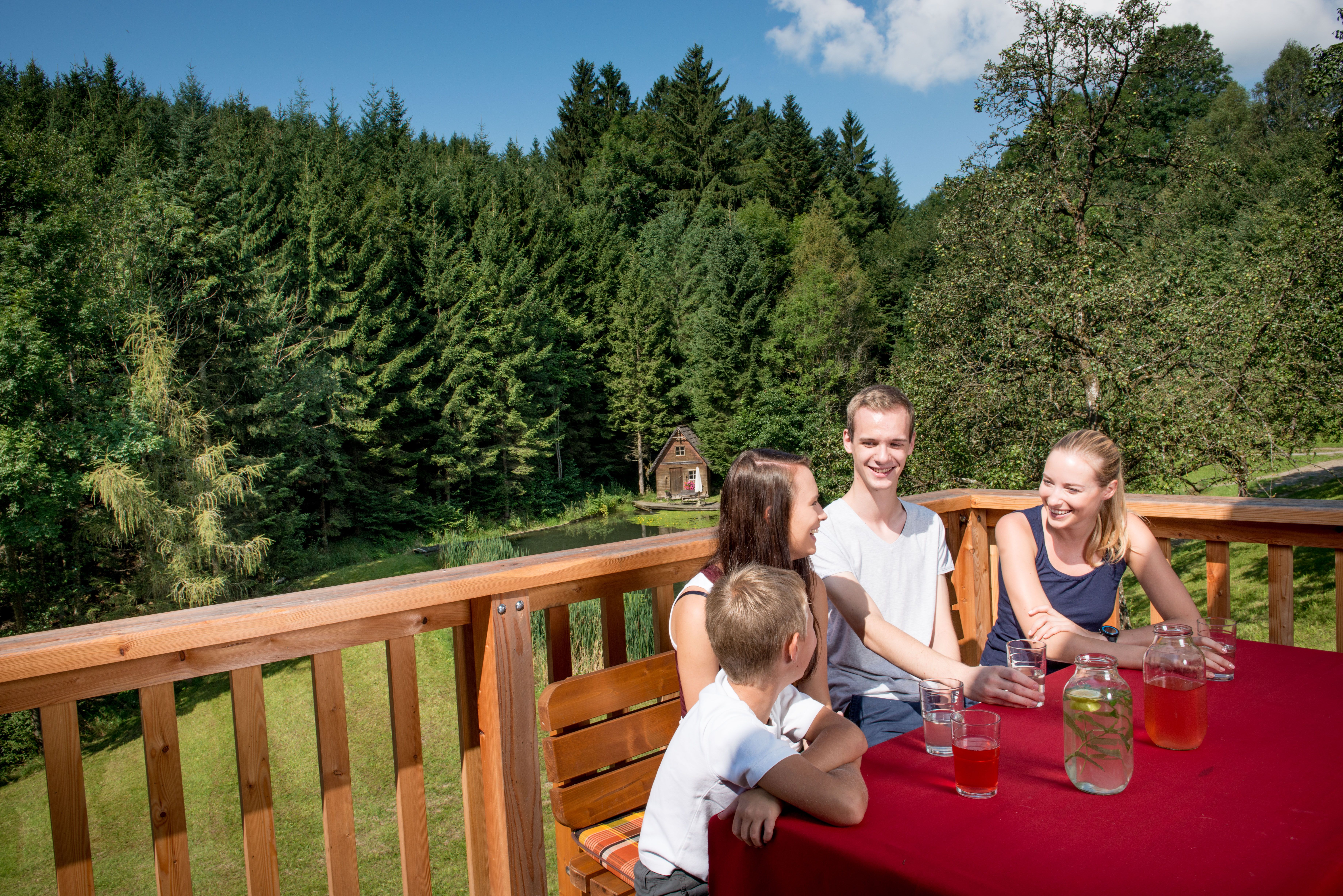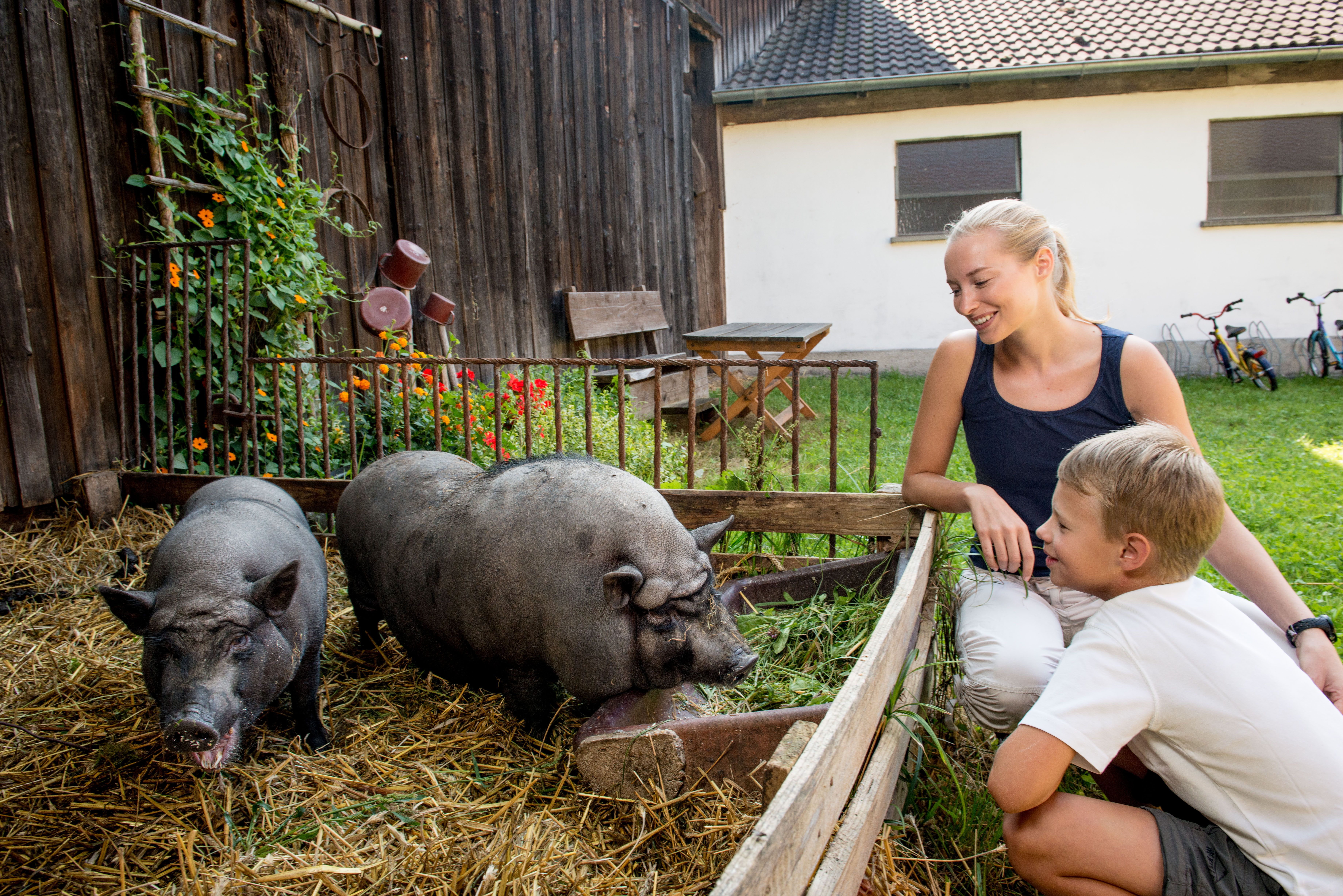 Urlaub im rustikalen Knusperhaus – das ist Urlaub am Bauernhof de luxe! Genießen Sie die großen Zimmer, Wohnküche, Balkon und Sonnenterrasse, das Turmzimmer und das Wellnessbad. Vom Balkon und vom Frühstücksplatz im Freien sehen Sie auf den Teich und die urige Hütte. Kühe und Kälber, Minischweine und Katzen - Bauernhof pur eben! Die „Auszeit-Schaukel“ ist ein idealer Platz zum Entspannen. Erleben Sie eine besondere Auszeit im südlichen Waldviertel. Finden Sie Zeit und Muße zum Durchatmen, zum Staunen und Genießen.