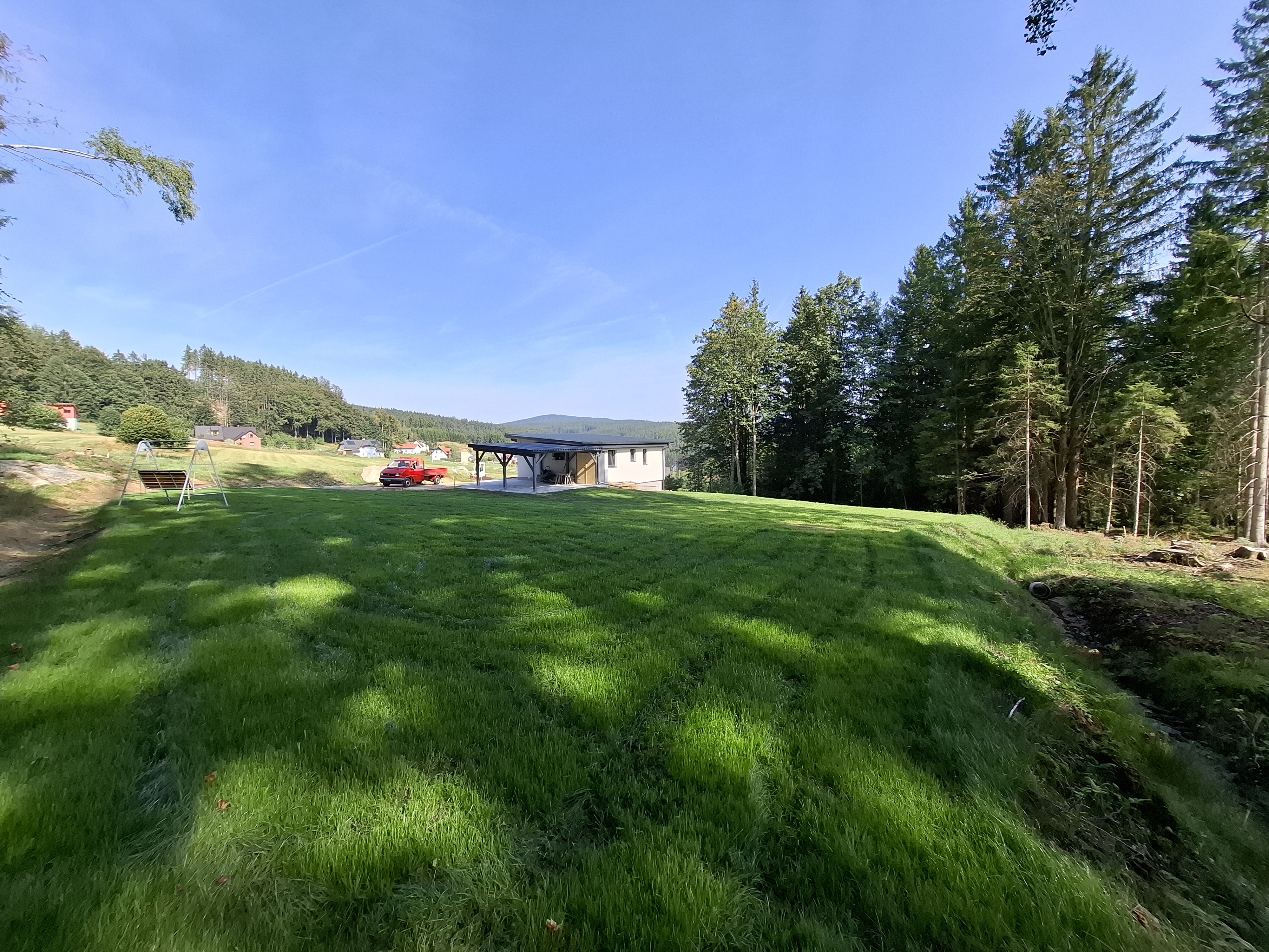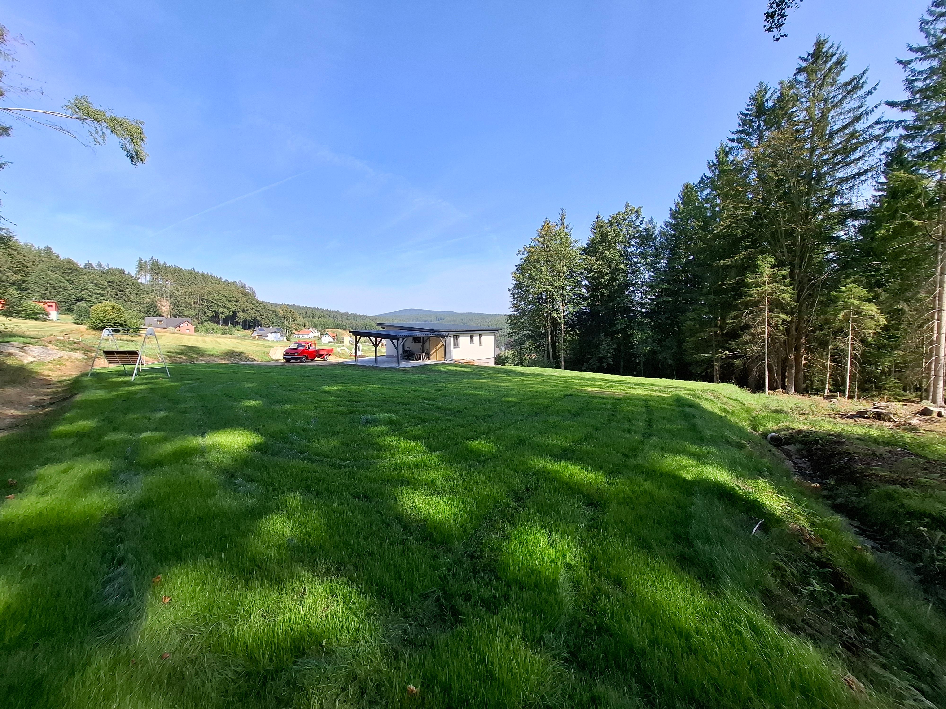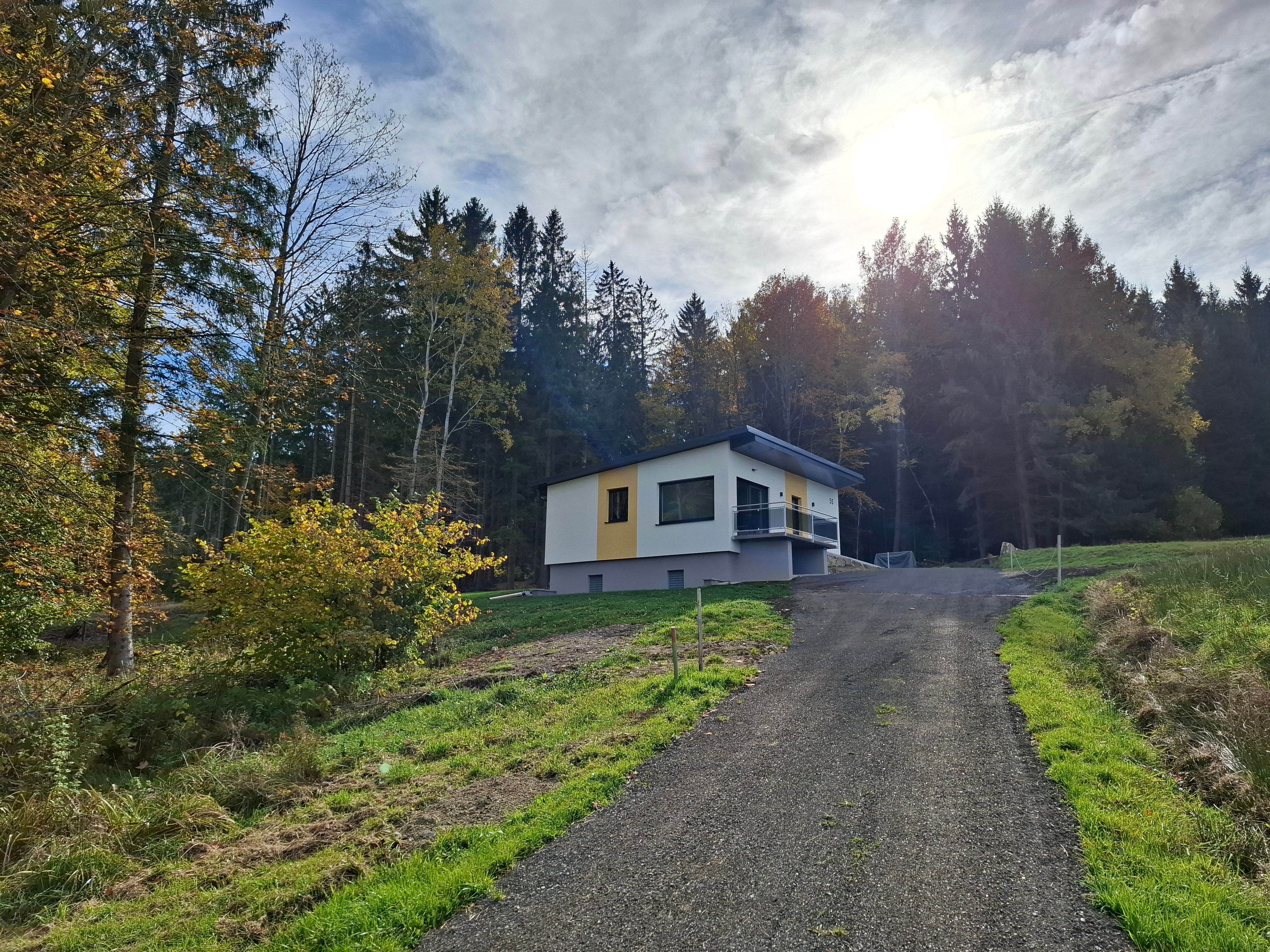 Der lichtdurchflutete Wohnbereich ermöglicht es, die Natur direkt von der Couch aus zu beobachten. Die sonnige Terrasse, direkt vom Wohnzimmer aus begehbar, lädt an lauen Sommernächten zum Verweilen ein und bietet einen ungestörten Fernblick ins Grüne. Auf einer weiteren Terasse können Sie morgens beim Frühstück Sonne tanken. Ein angrenzendes, sanft plätscherndes Bächlein verstärkt das Gefühl der Ruhe und trägt zum entspannten Wohlbefinden bei.