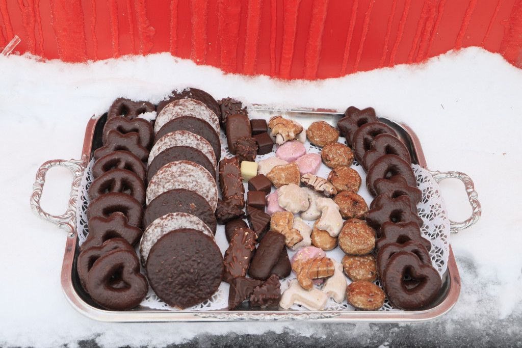 eine Auswahl an verschiedenen leckeren Lebkuchen und Keksen. Dazu sorgen Glühwein und Kinderpunsch