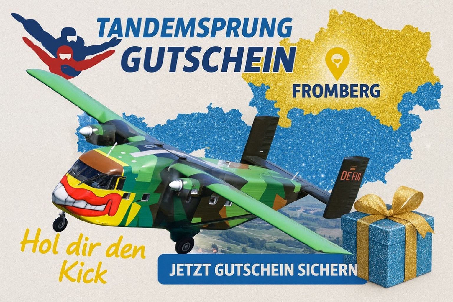 Willkommen in Fromberg – hier wird Fallschirmspringen in Fromberg zur Mischung aus Top-Aussicht und sauberem Ablauf. Mit routinierter Crew, klaren Briefings und kurzen Wegen startest du entspannt in deinen Tandemsprung in Fromberg. Dank Live-Verfügbarkeiten im Kalender planst du flexibel – perfekt fürs Waldviertel, ganz Niederösterreich. Beim Fallschirmsprung in Fromberg warten ~60 Sekunden Freifall, anschließend ruhige Schirmfahrt und präziser Landeanflug. Ob als Geschenk, Gutschein oder Jubiläums-Highlight – 2026 feiern wir „Pink Boogie – 40 Jahre“ mit extra Stimmung am Platz. Du willst Erinnerungen? Medienpakete sind optional – Handcam oder externer Kameraflyer.