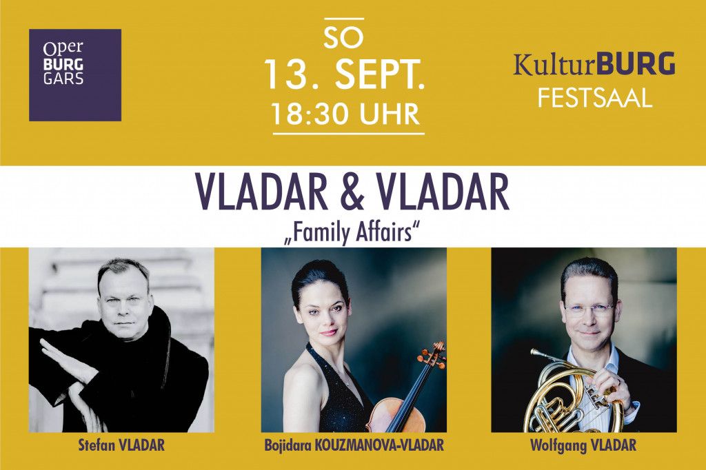 Starpianist STEFAN VLADAR, Philharmoniker WOLFGANG VLADAR und Weltklassegeigerin BOJIDARA KOUZMANOVAVLADAR, präsentieren ein Programm voller Virtuosität, Ausdruckskraft und mitreißender Höhepunkte. Gemeinsam musizieren die renommierten Künstler auf der Bühne der Garser KulturBURG Werke von César Franck und Johannes Brahms – ergänzt durch eine musikalische Überraschung.